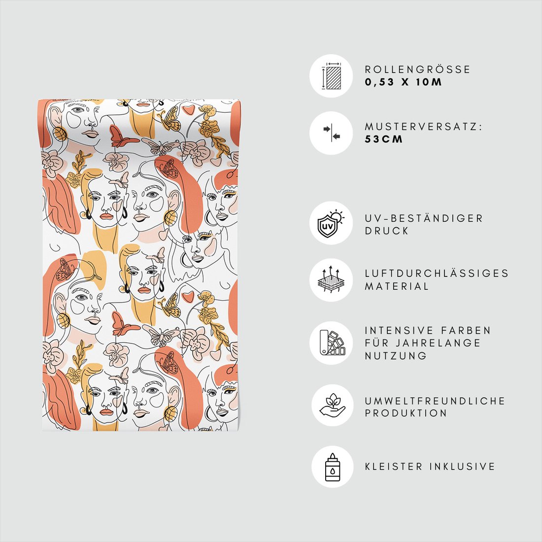 Odkryj piękno i funkcjonalność tapety z motywem twarze, motyle, kwiaty. To połączenie wyjątkowego wzornictwa z łatwością aplikacji, doskonałe do każdego pomieszczenia.