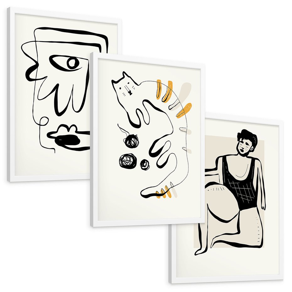 Zestaw obrazy w ramie, plakaty - abstrakcja, rysunek, minimalizm - rama biała