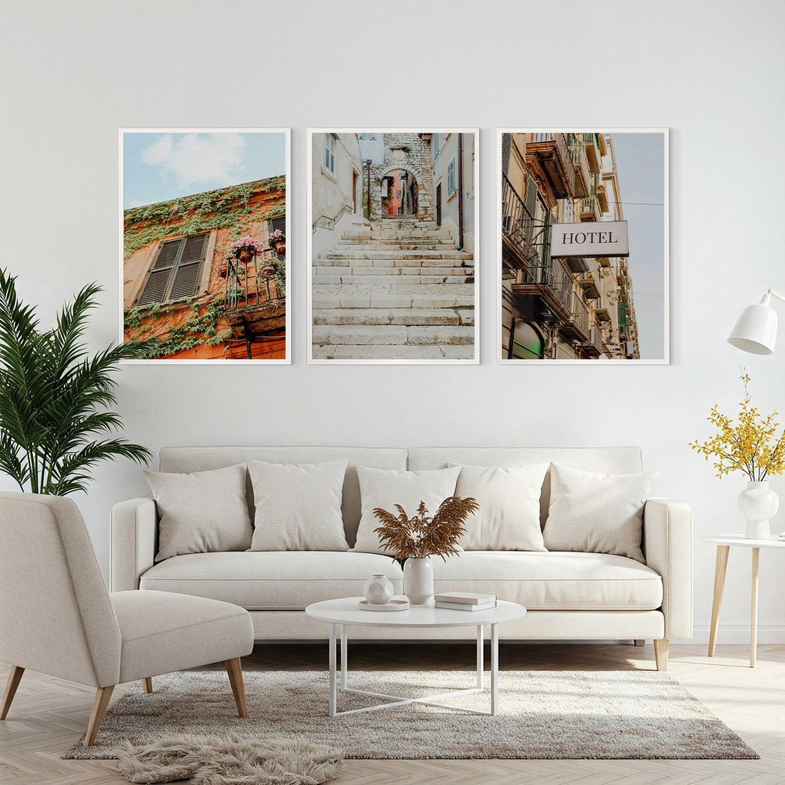 Zestaw obrazy w ramie, plakaty - architektura, budynki, kamień - rama biała