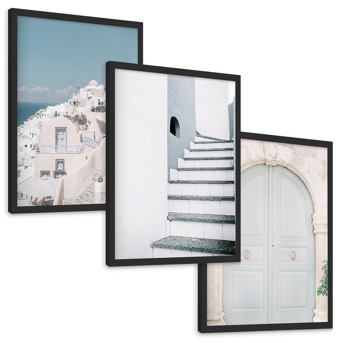 Zestaw obrazy w ramie, plakaty - architektura, pastelowe, śródziemnomorskie - rama czarna