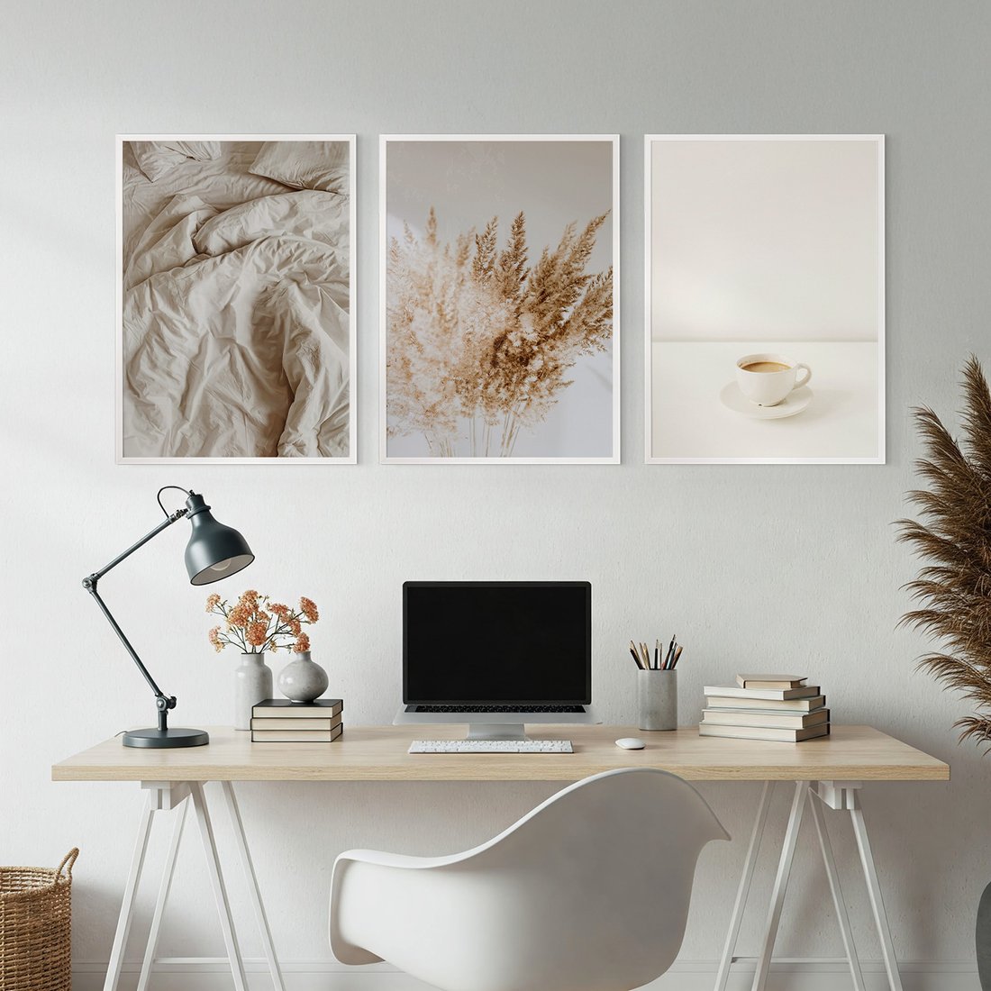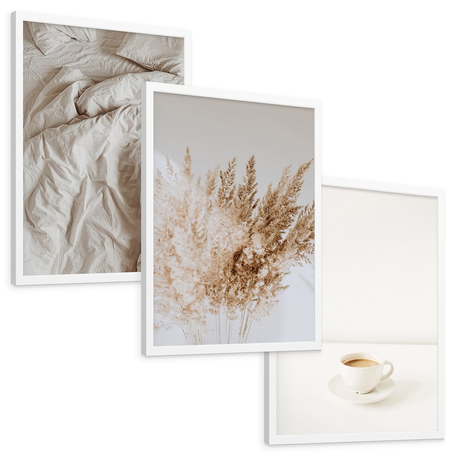 Zestaw obrazy w ramie, plakaty - beżowy, kawa, trawa - rama biała