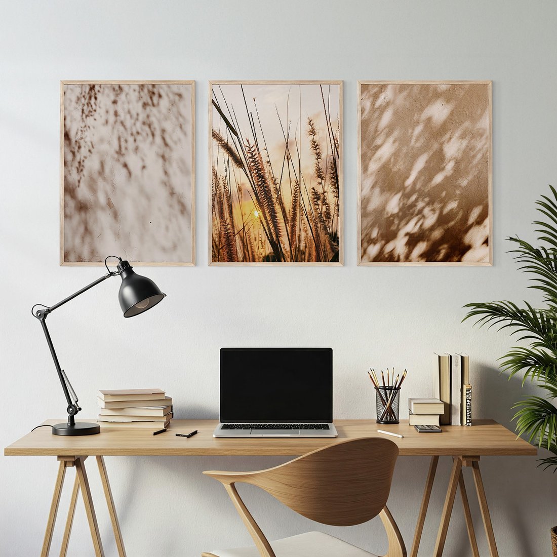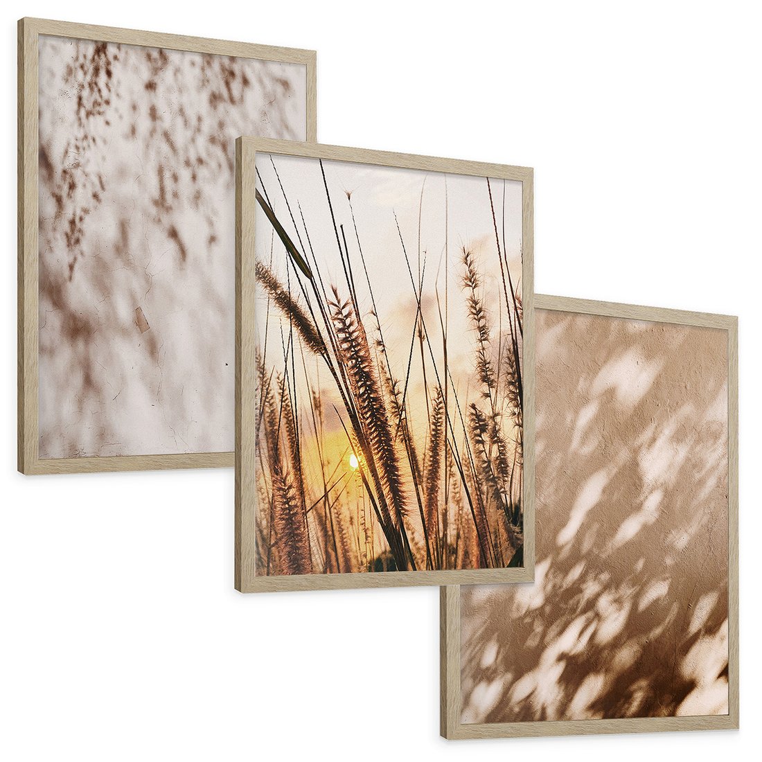 Zestaw obrazy w ramie, plakaty - cienie, trawa, abstrakcja - rama drewno