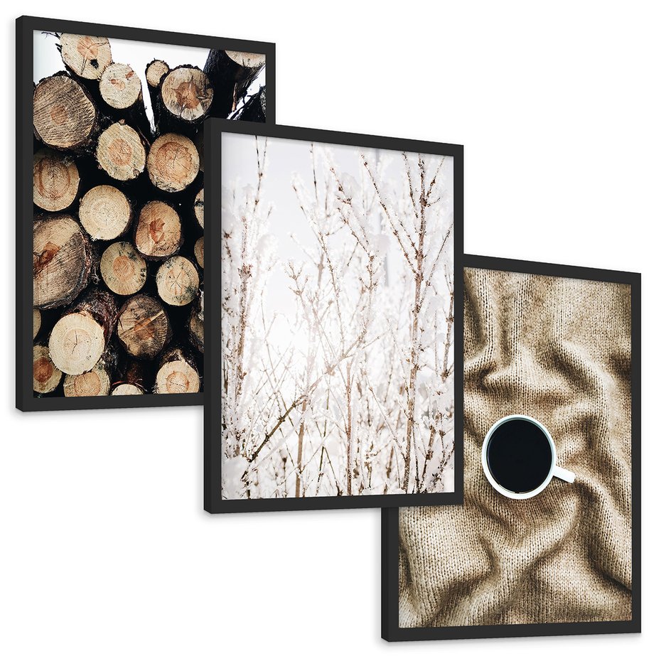 Zestaw obrazy w ramie, plakaty - drewno, zima, sweter - rama czarna