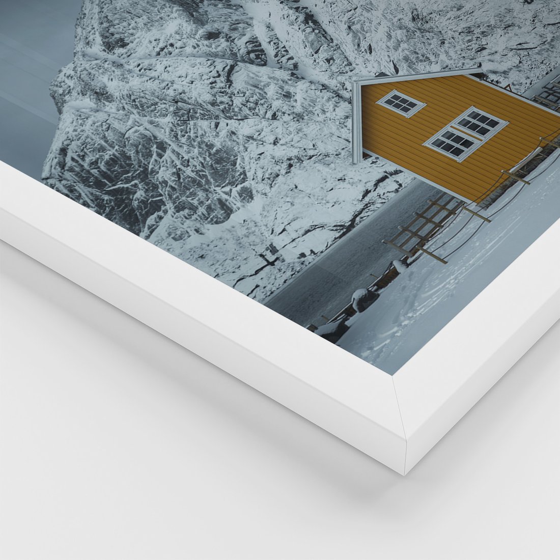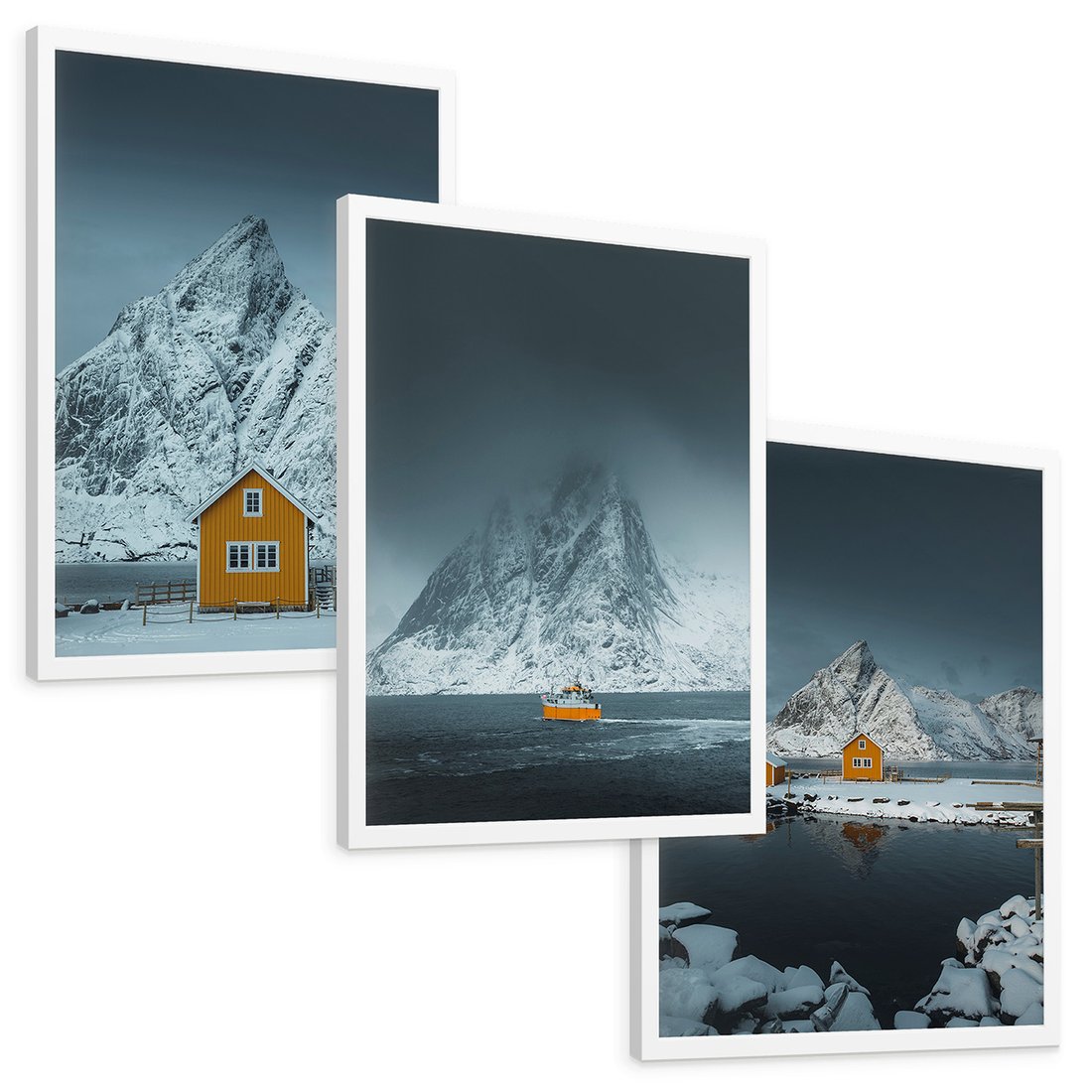 Zestaw obrazy w ramie, plakaty - góry, śnieg, domki - rama biała
