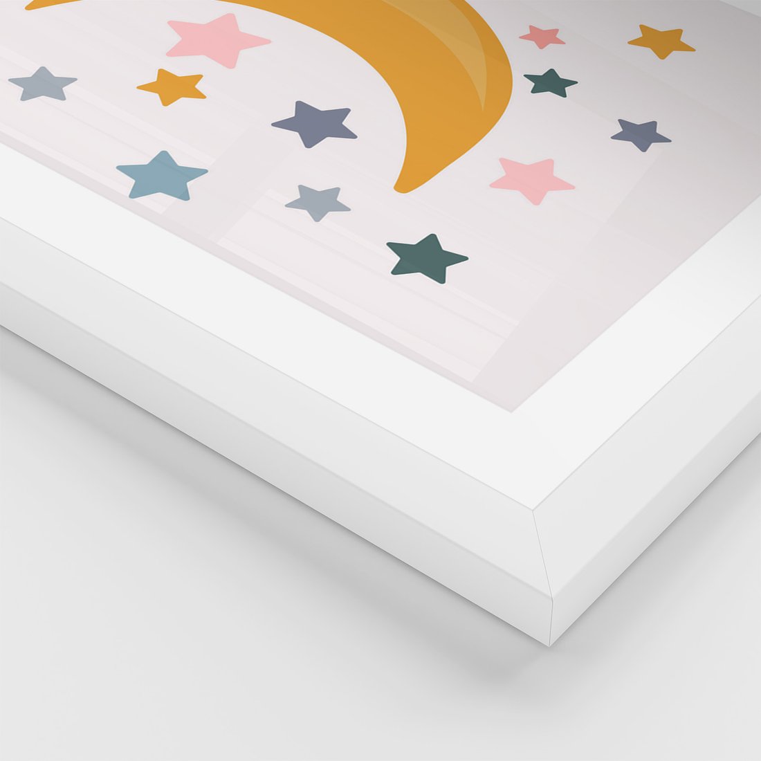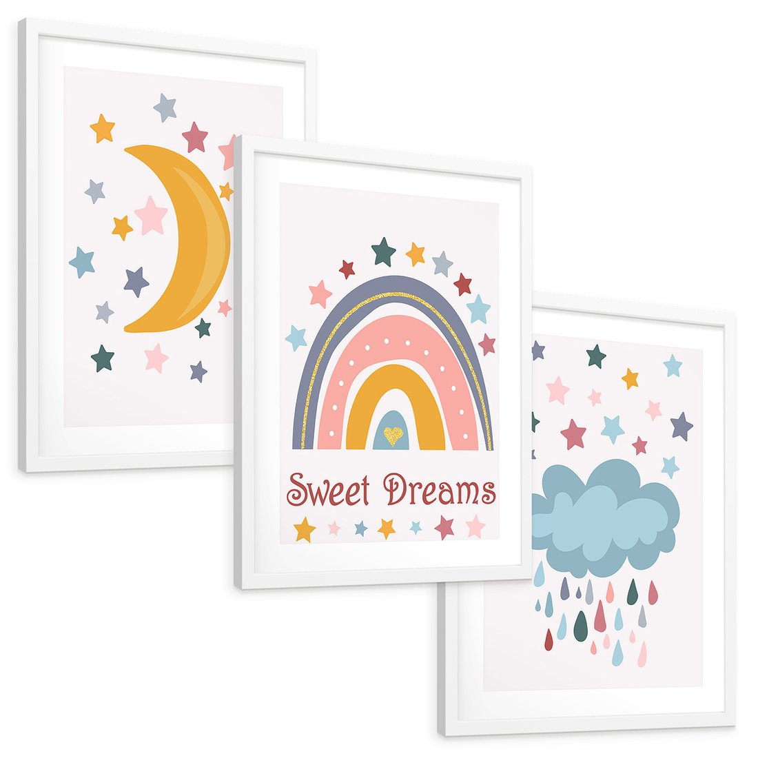Zestaw obrazy w ramie, plakaty - gwiazdy, księżyc, tęcza - rama biała