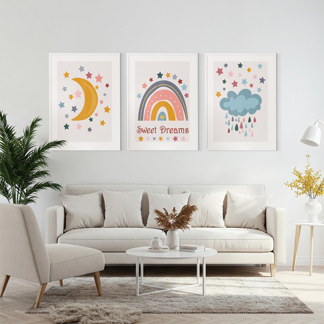 Przenieś piękno sztuki do swojego domu dzięki naszemu starannie skomponowanemu produktowi zestaw obrazów gwiazdy, księżyc, tęcza. Każdy plakat, oprawiony w elegancką ramę, łączy w sobie estetykę i trwałość. Uniwersalne wzornictwo sprawia, że te dekoracje ścienne doskonale komponują się z różnymi stylami wnętrz, od nowoczesnych po klasyczne. Łatwość montażu pozwala na szybką i bezproblemową metamorfozę Twojej przestrzeni. To również idealny pomysł na wyszukany prezent, który z pewnością zachwyci.
