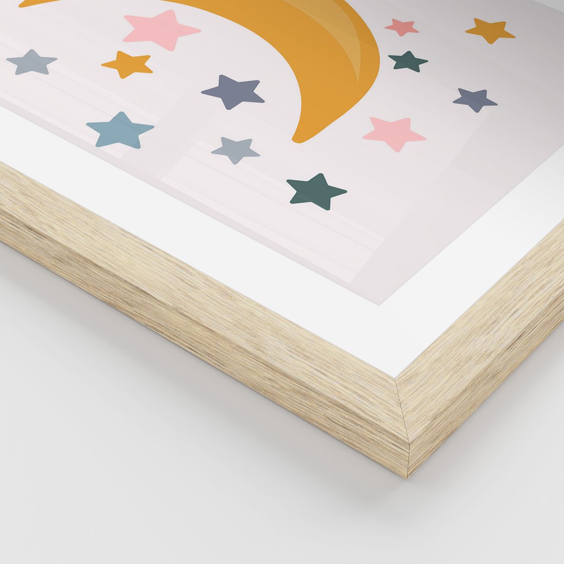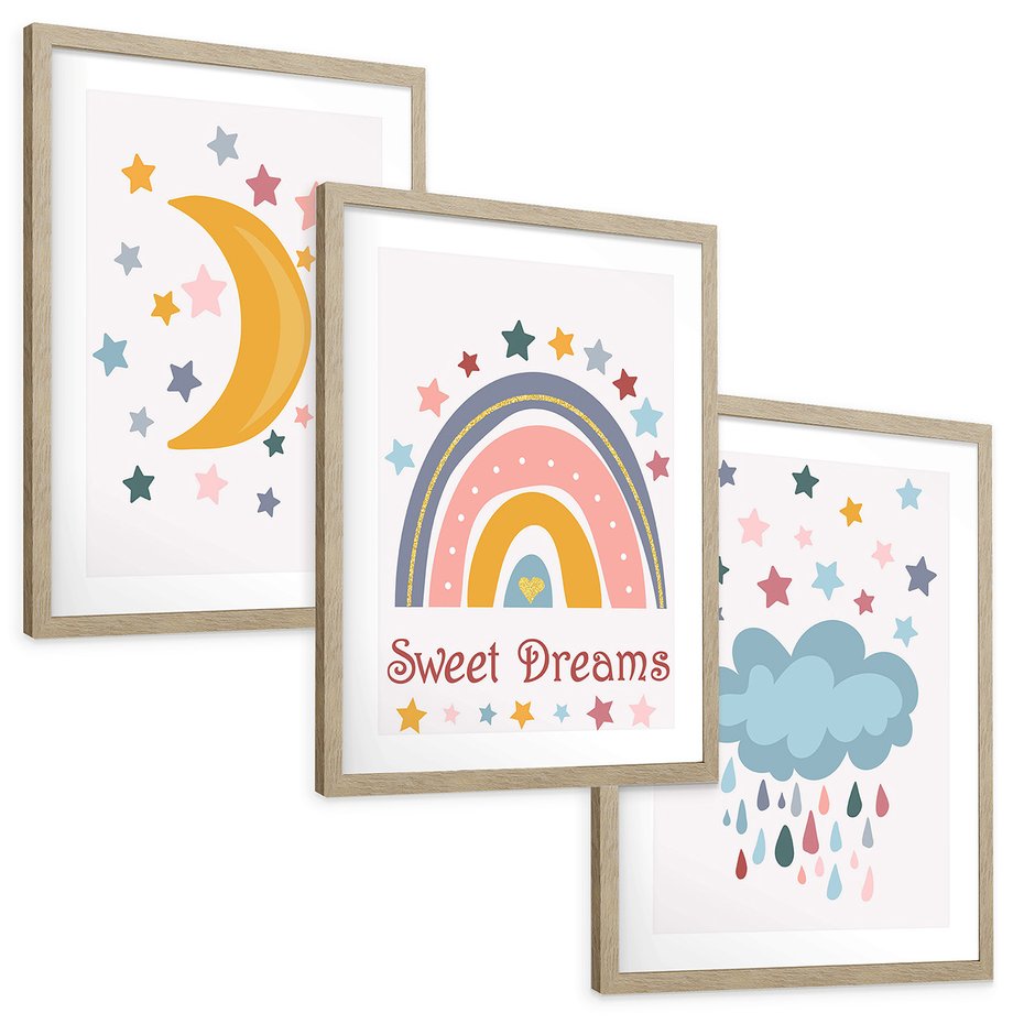 Zestaw obrazy w ramie, plakaty - gwiazdy, księżyc, tęcza - rama drewno