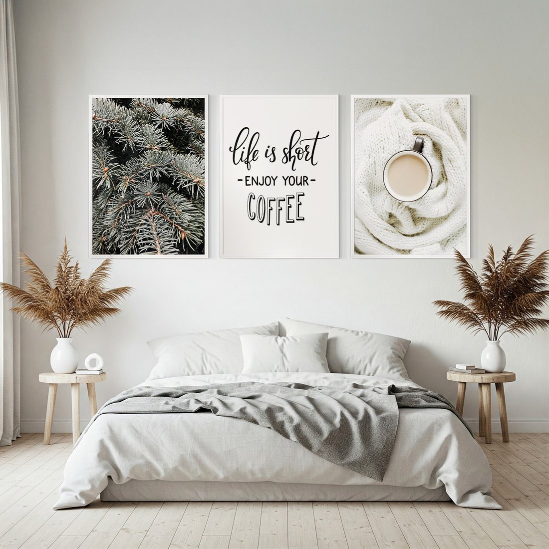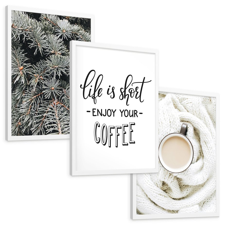 Zestaw obrazy w ramie, plakaty - igły, kawa, sweter - rama biała