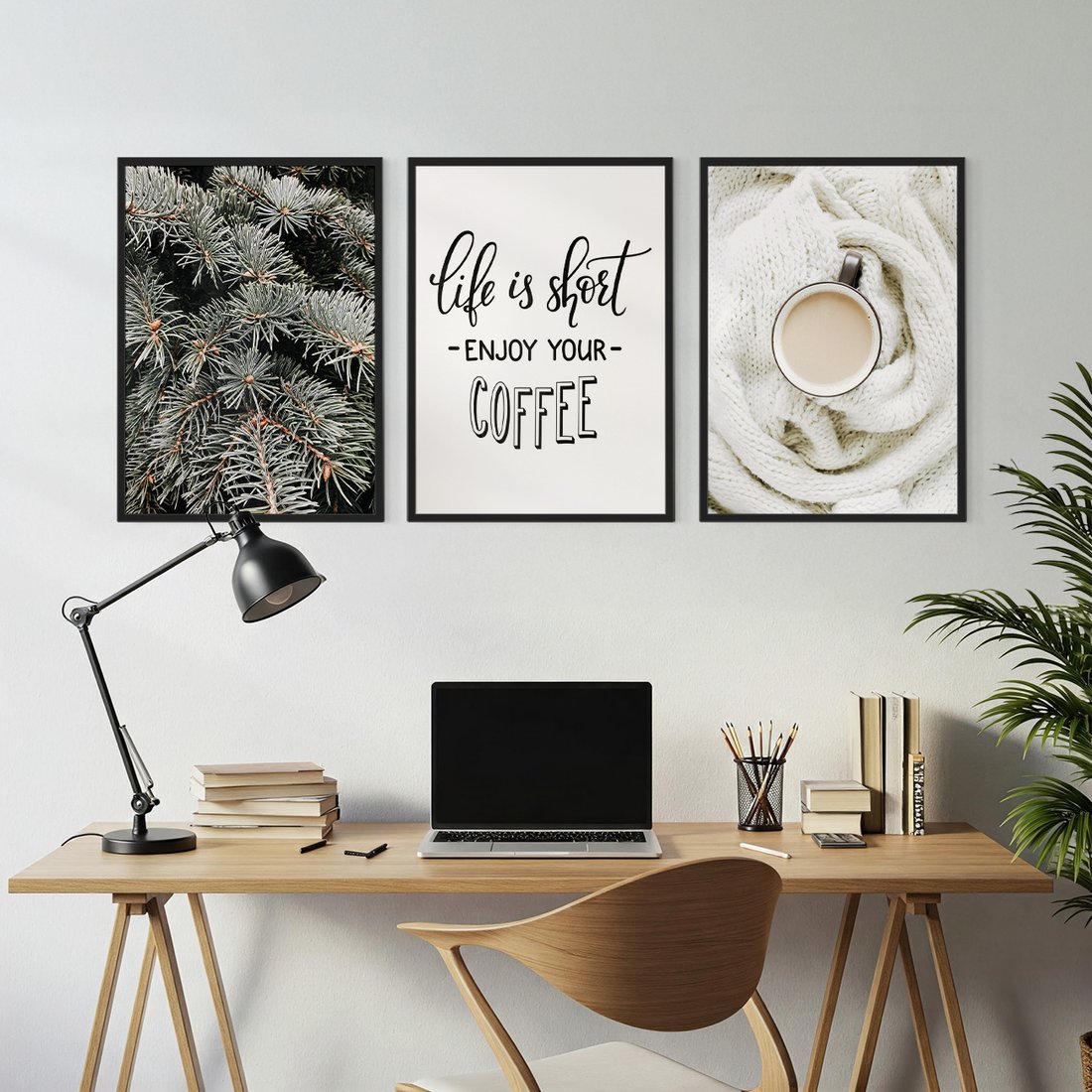 Zestaw obrazy w ramie, plakaty - igły, kawa, sweter - rama czarna