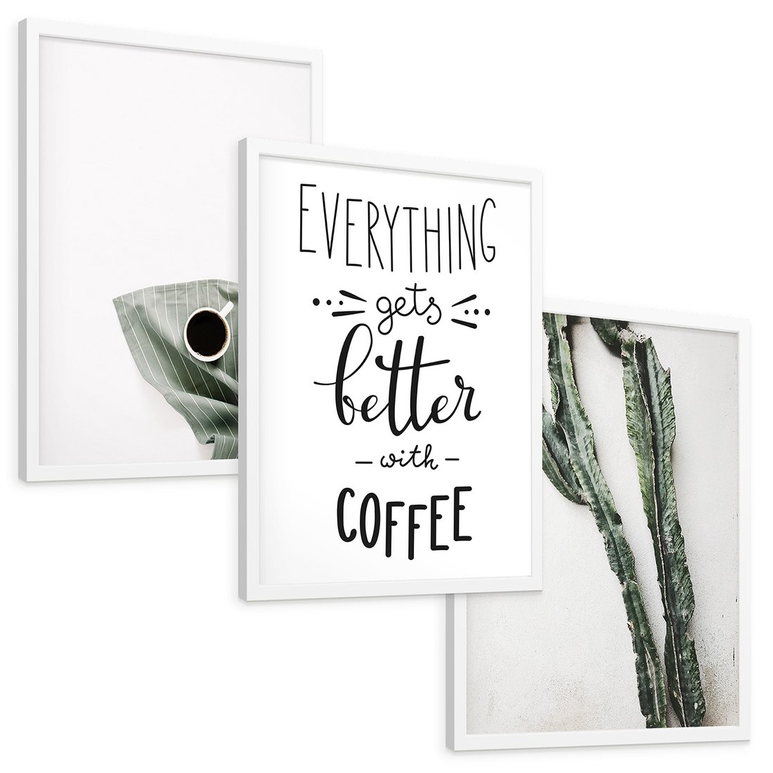 Zestaw obrazy w ramie, plakaty - kawa, kaktus, napisy - rama biała