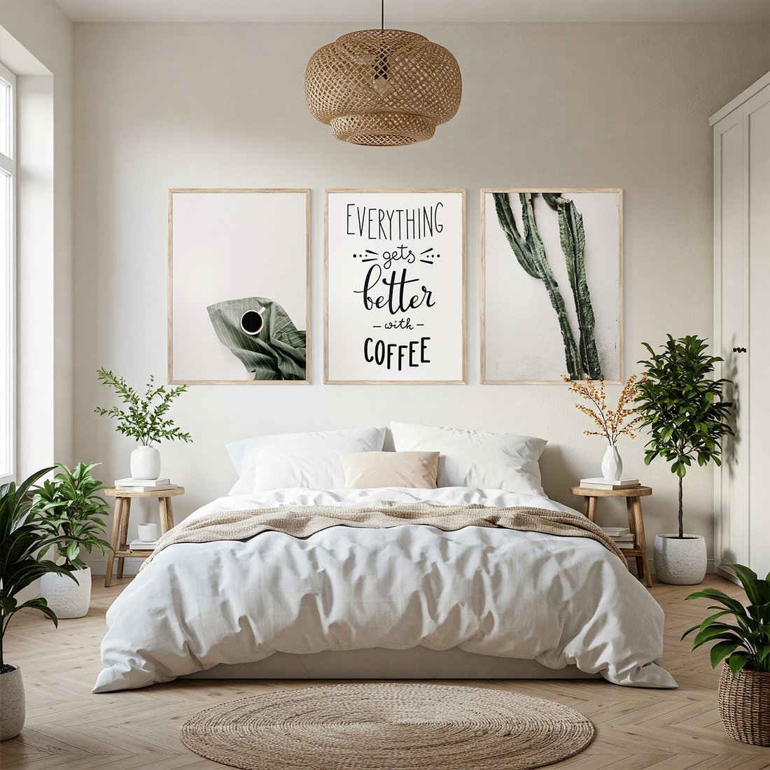 Przenieś piękno sztuki do swojego domu dzięki naszemu starannie skomponowanemu produktowi zestaw obrazów kawa, kaktus, napisy. Każdy plakat, oprawiony w elegancką ramę, łączy w sobie estetykę i trwałość. Uniwersalne wzornictwo sprawia, że te dekoracje ścienne doskonale komponują się z różnymi stylami wnętrz, od nowoczesnych po klasyczne. Łatwość montażu pozwala na szybką i bezproblemową metamorfozę Twojej przestrzeni. To również idealny pomysł na wyszukany prezent, który z pewnością zachwyci.