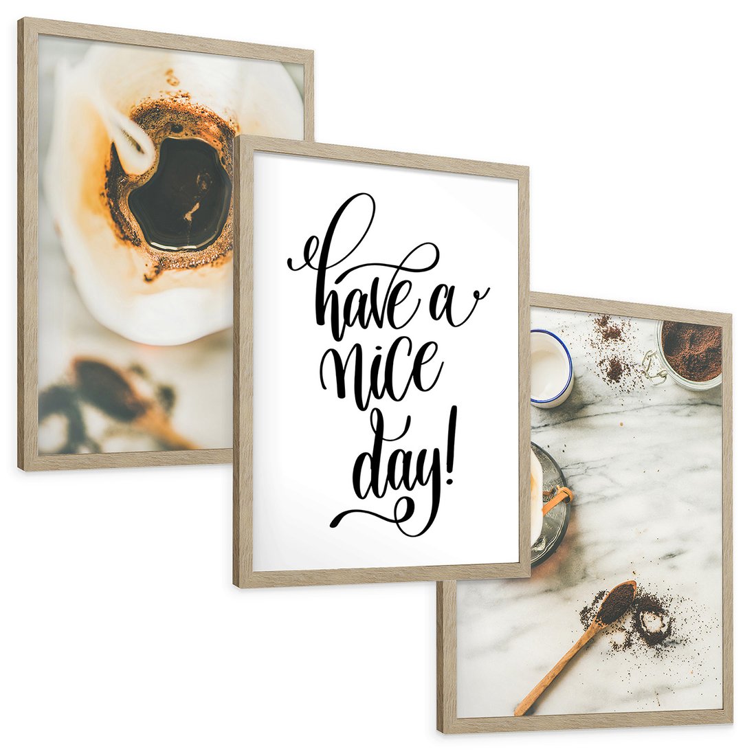 Zestaw obrazy w ramie, plakaty - kawa, napój, filiżanka - rama drewno