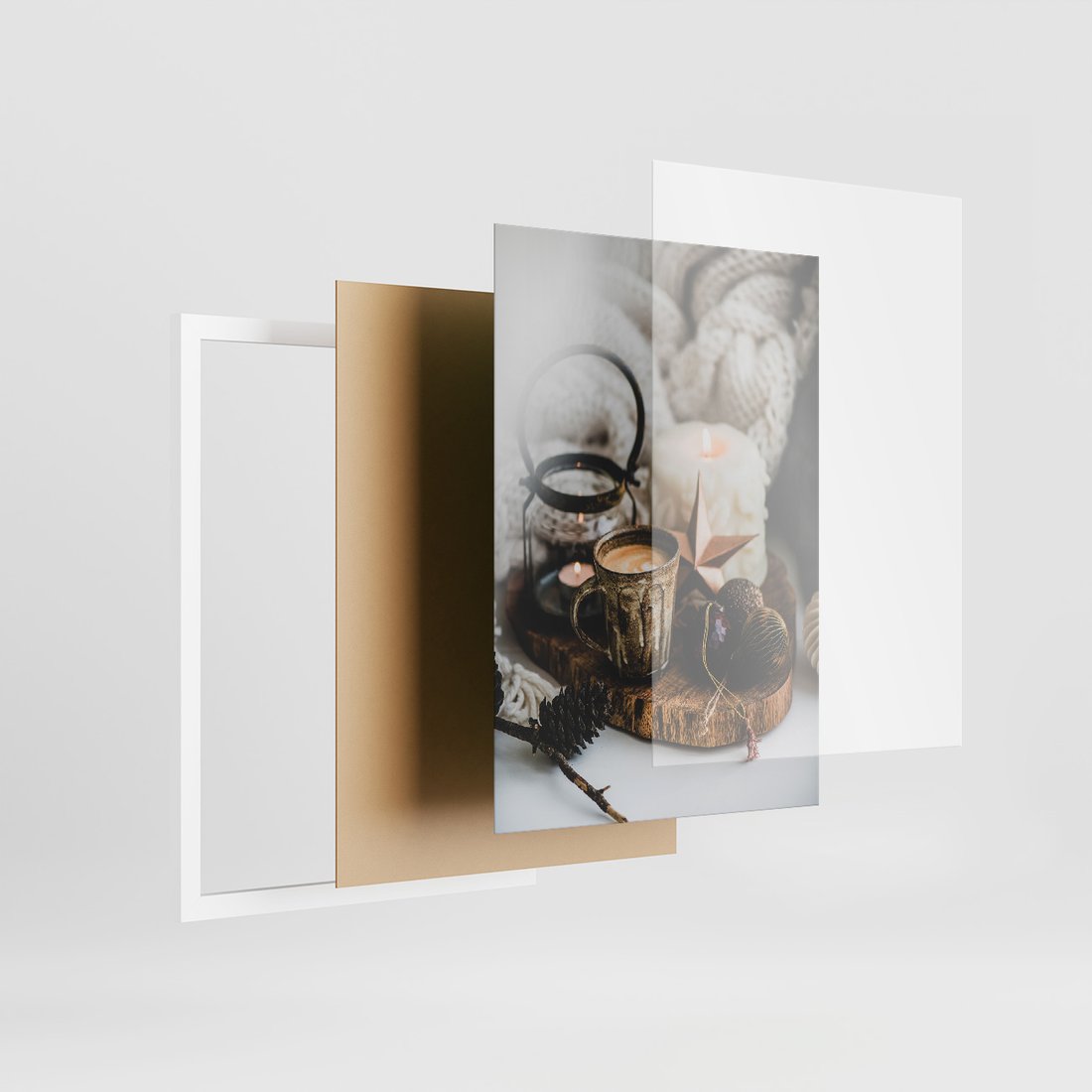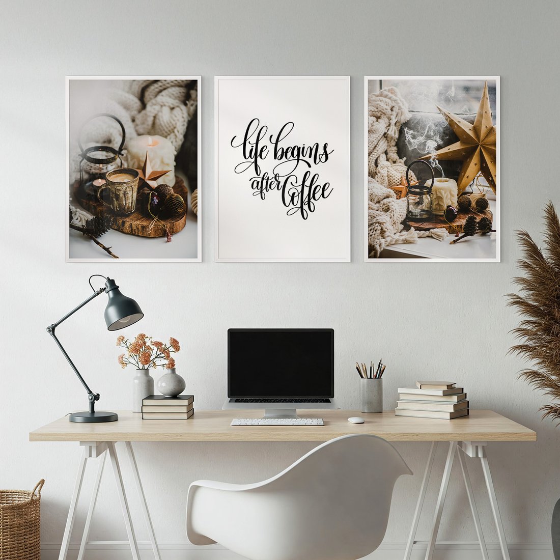 Zestaw obrazy w ramie, plakaty - kawa, świece, dekoracje - rama biała