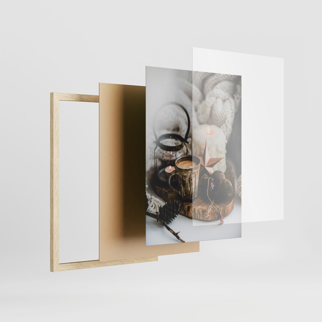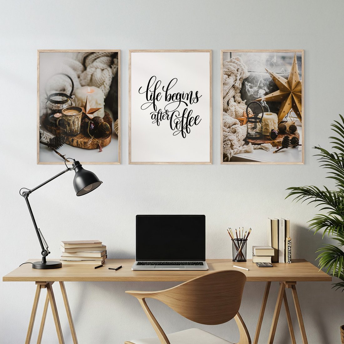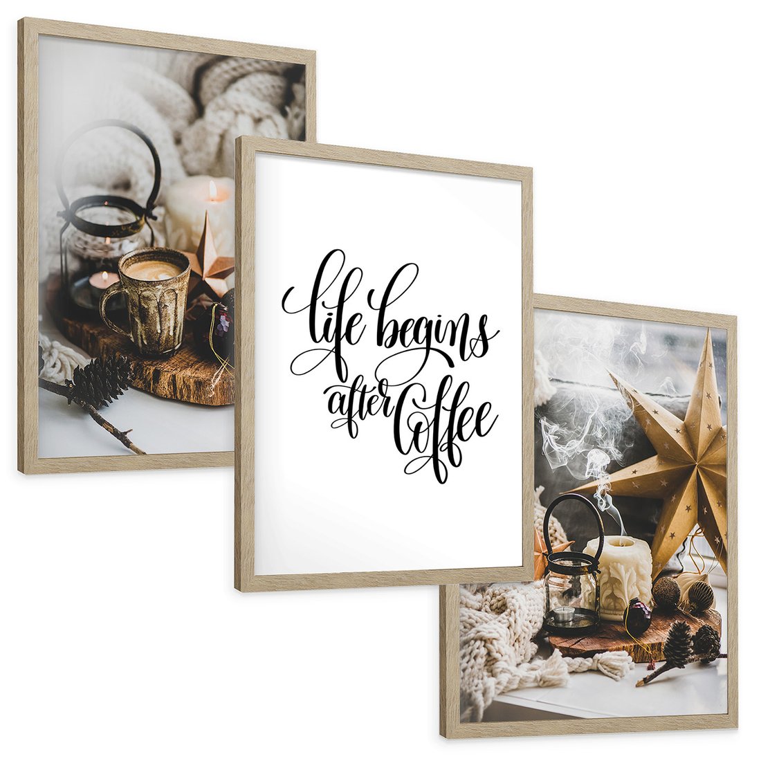Zestaw obrazy w ramie, plakaty - kawa, świece, dekoracje - rama drewno