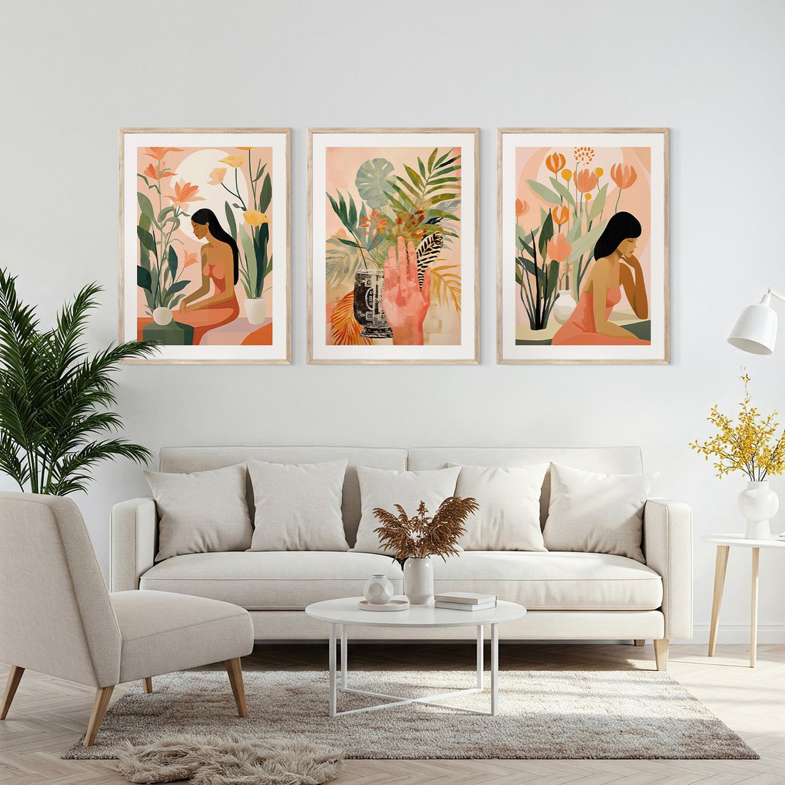 • Zestaw obrazy w ramie, plakaty - kobieta, kwiaty, liście