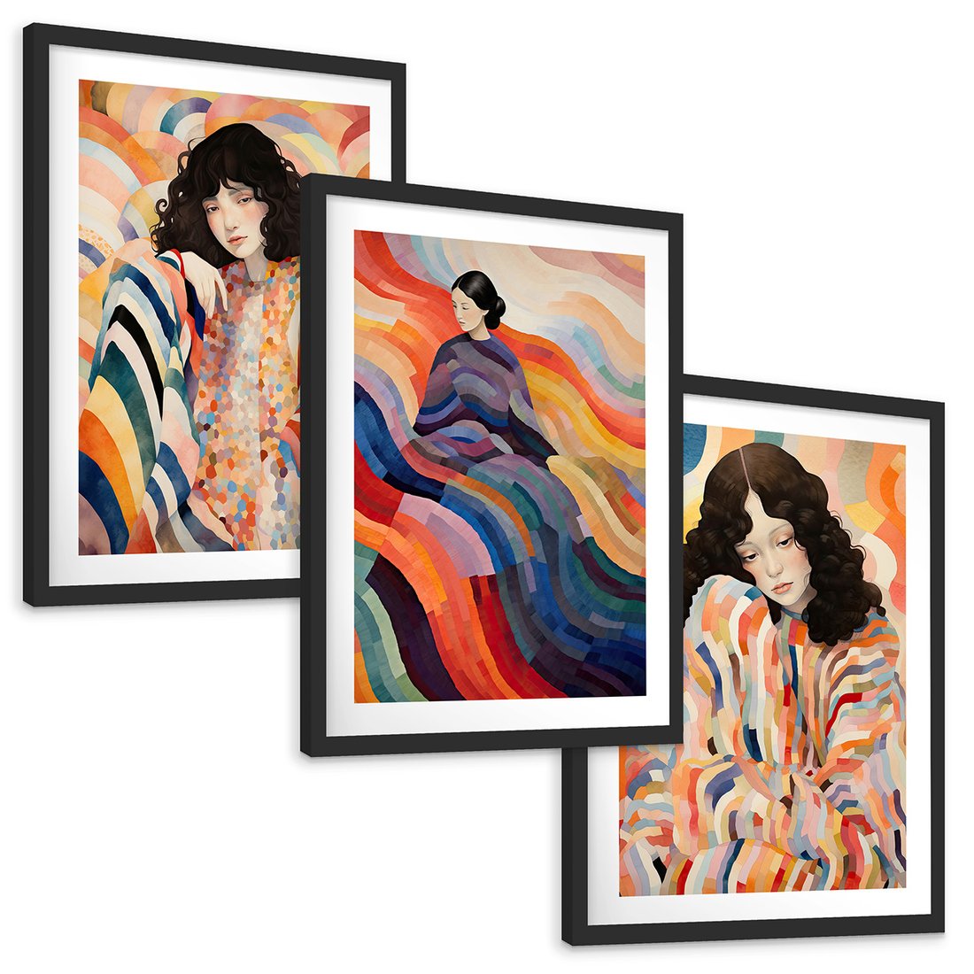 Zestaw obrazy w ramie, plakaty - kobieta, wzory, kolory, - rama czarna