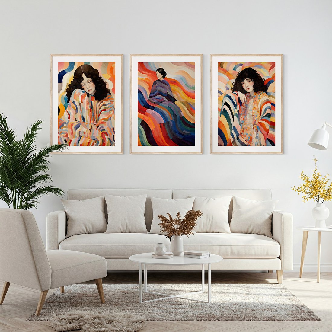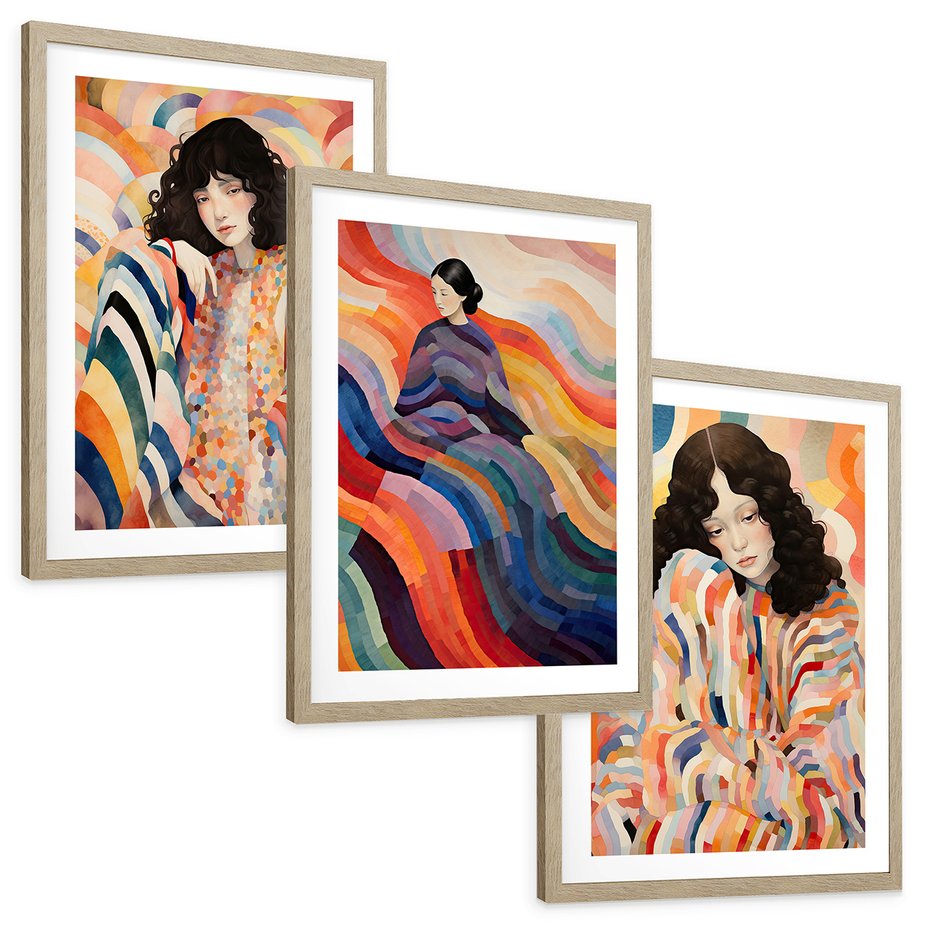 Zestaw obrazy w ramie, plakaty - kobieta, wzory, kolory, - rama drewno
