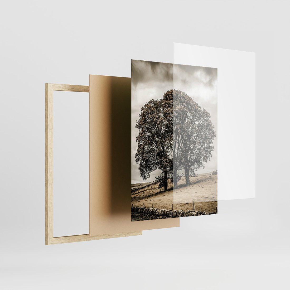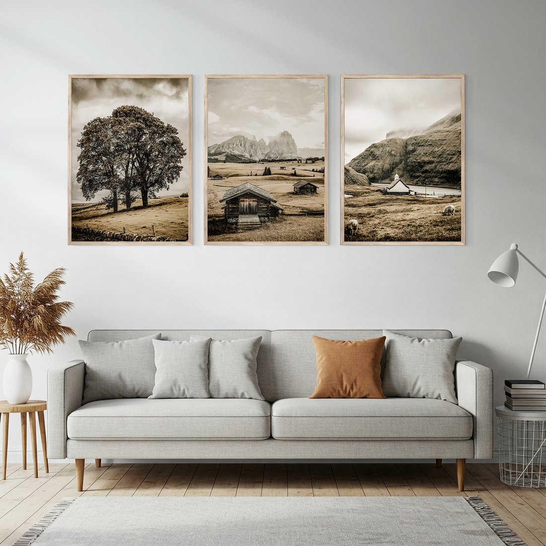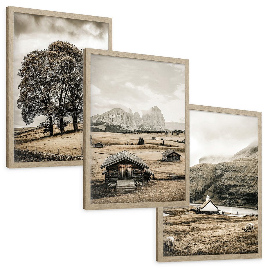 Zestaw obrazy w ramie, plakaty - krajobraz, góry, drzewa - rama drewno