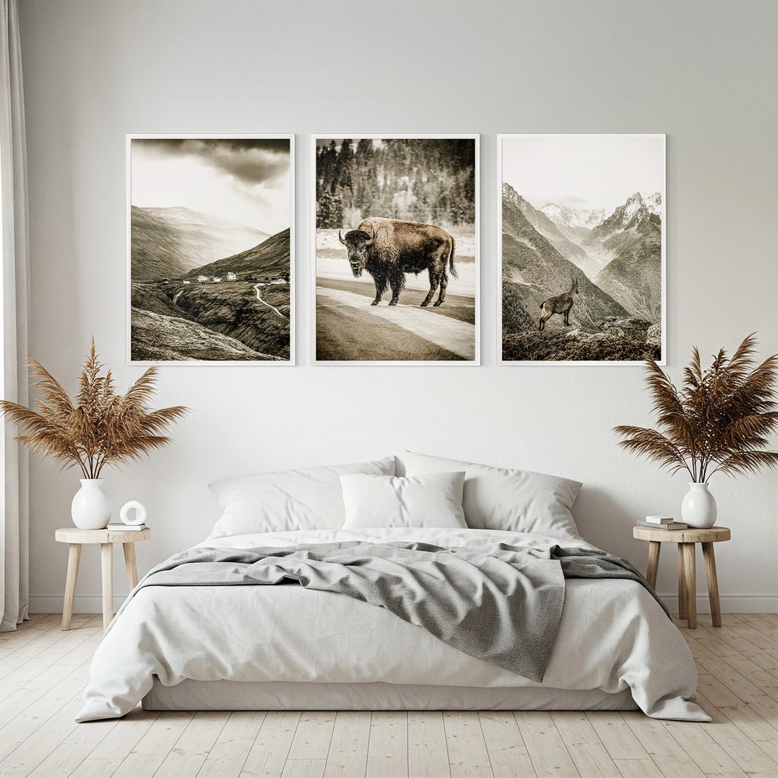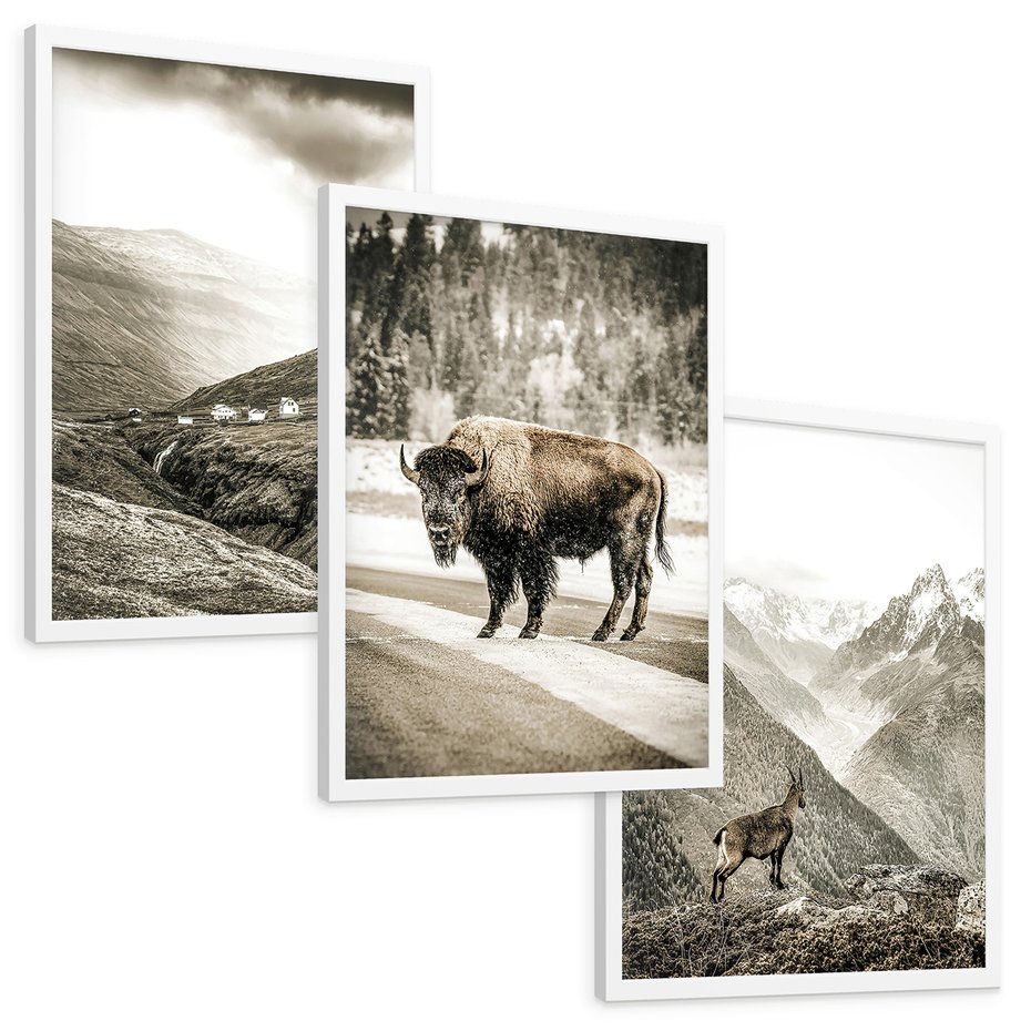Zestaw obrazy w ramie, plakaty - krajobraz, zwierzę, góry - rama biała