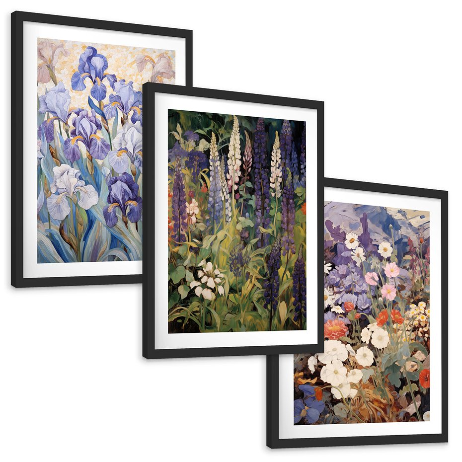 Zestaw obrazy w ramie, plakaty - kwiaty, irysy, rośliny - rama czarna