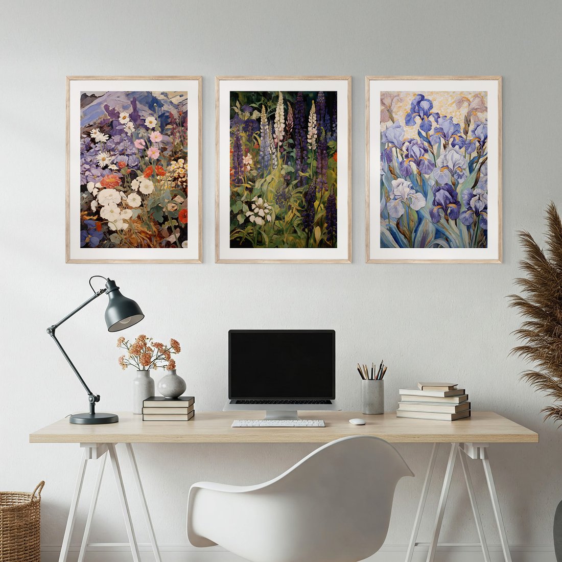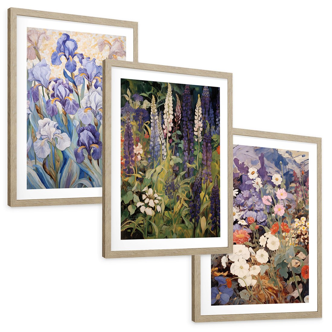 Zestaw obrazy w ramie, plakaty - kwiaty, irysy, rośliny - rama drewno