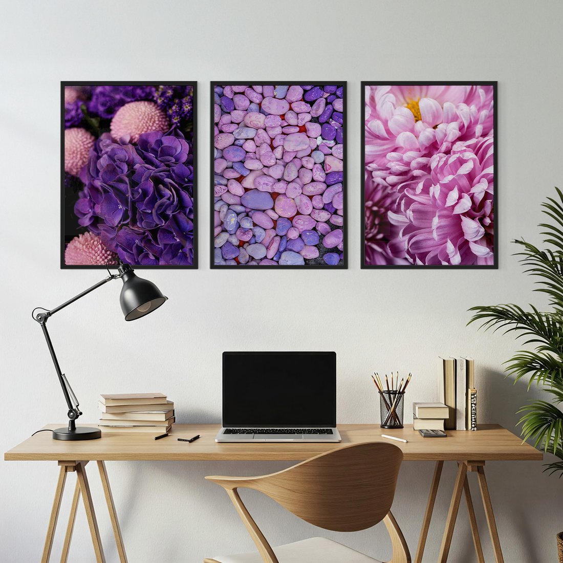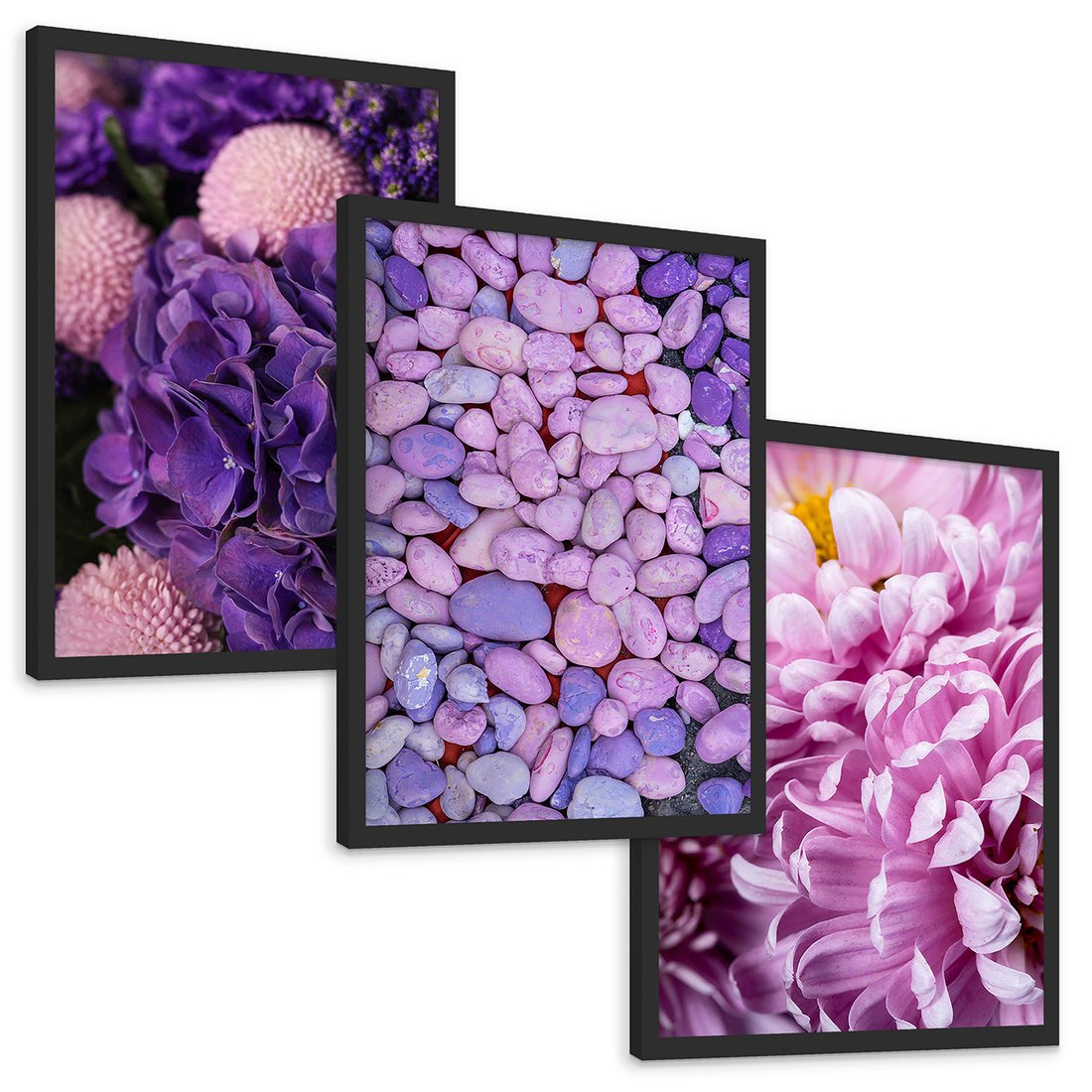 Zestaw obrazy w ramie, plakaty - kwiaty, kamienie, fioletowy - rama czarna