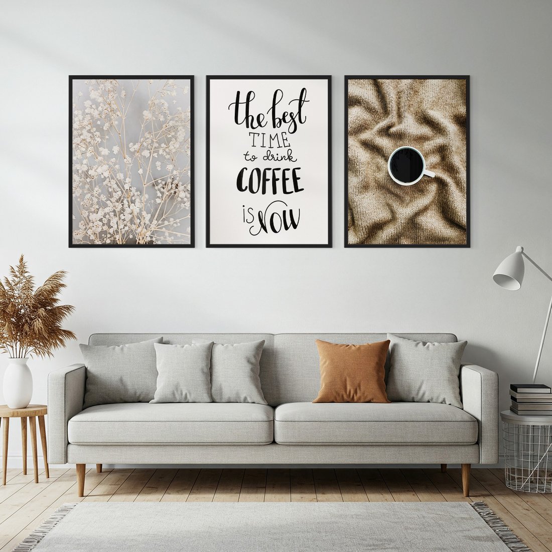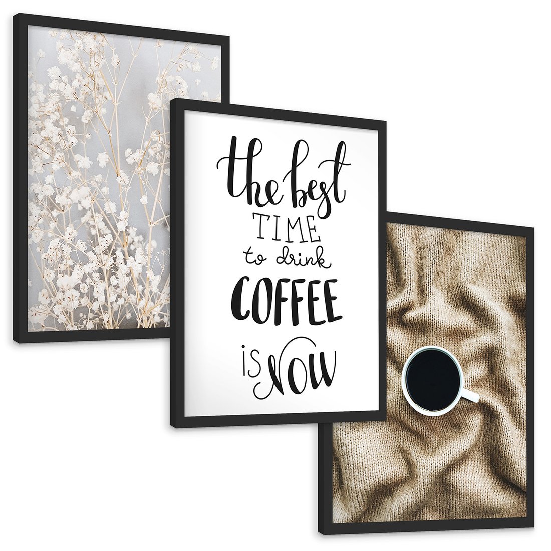 Zestaw obrazy w ramie, plakaty - kwiaty,kawa,tekst - rama czarna