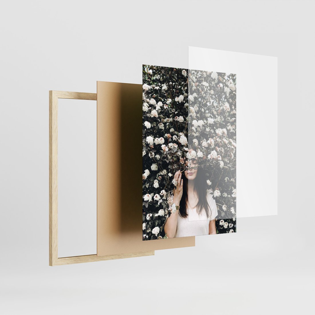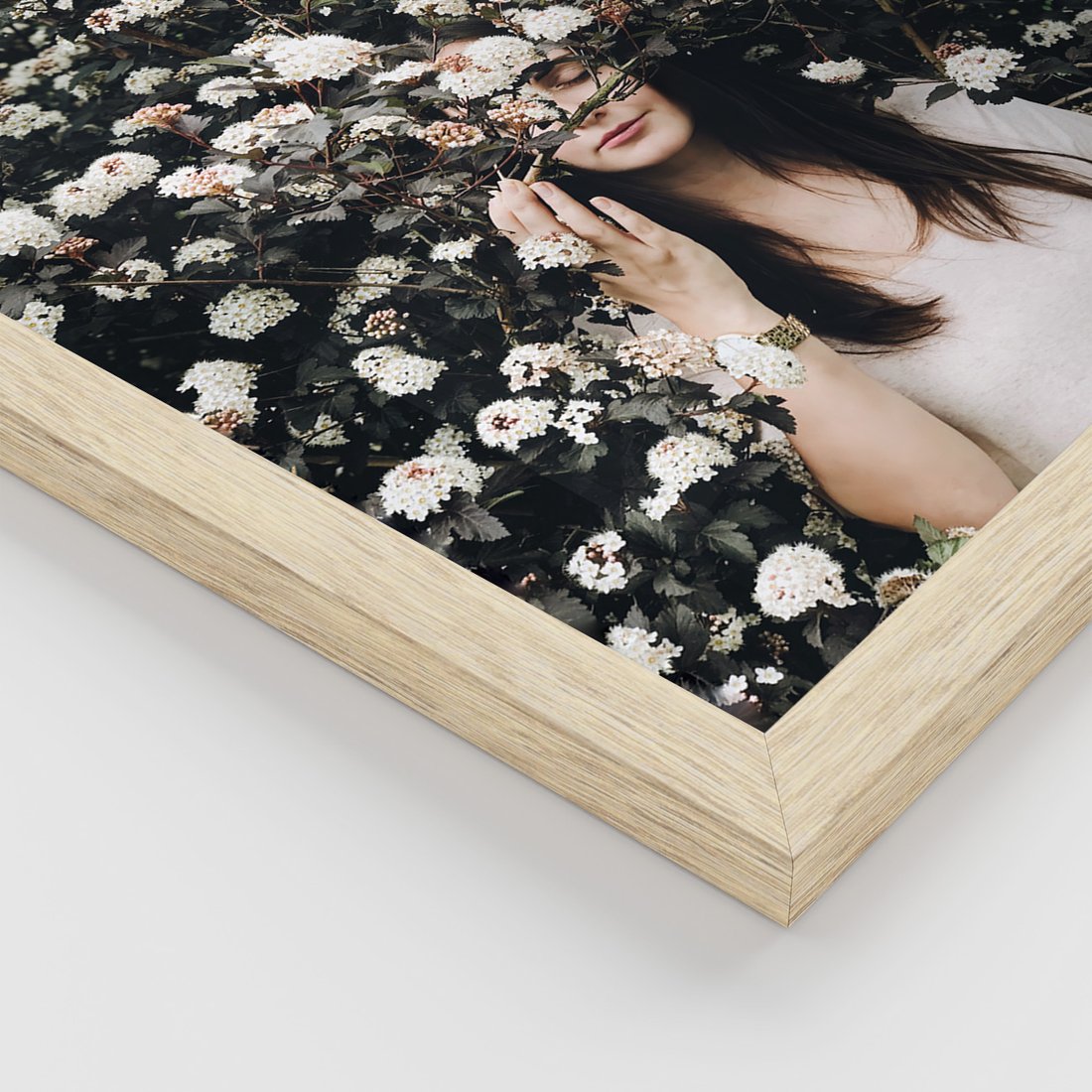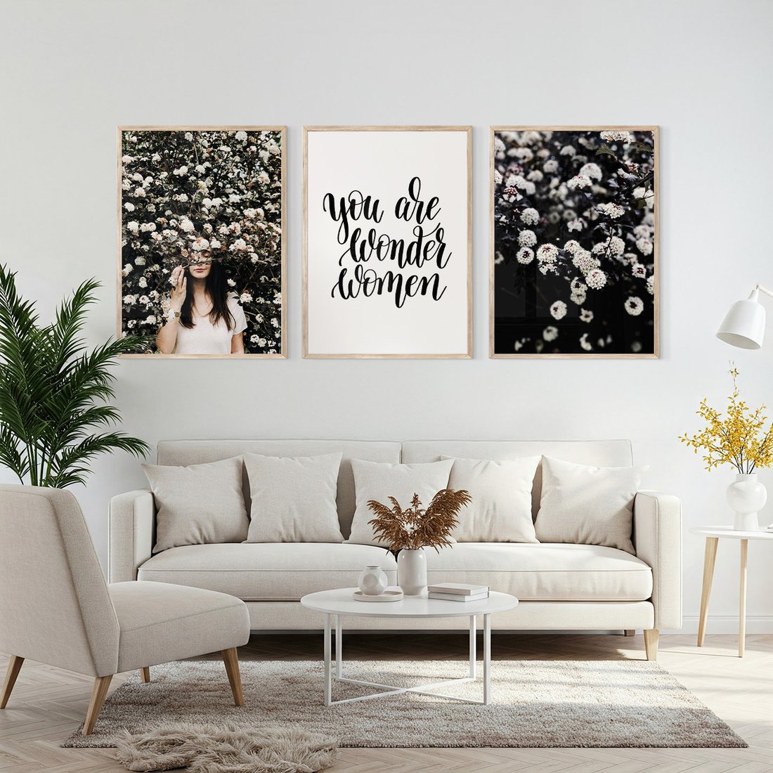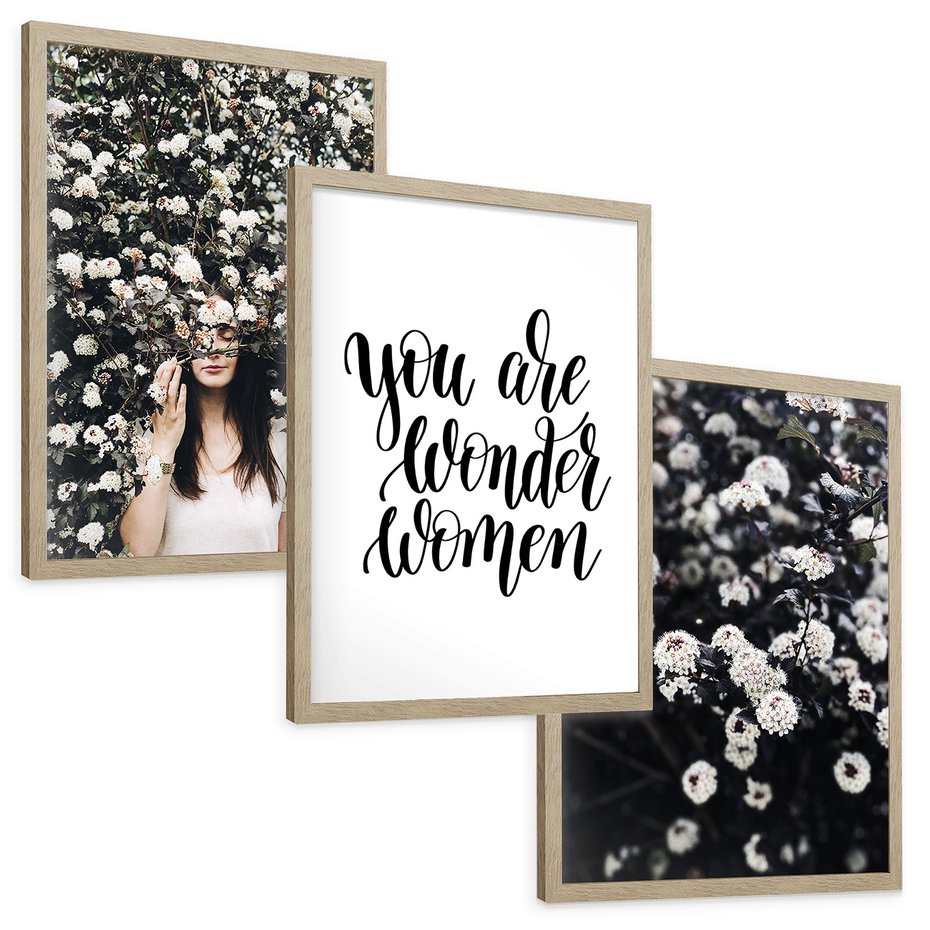 Zestaw obrazy w ramie, plakaty - kwiaty, kobieta, napisy - rama drewno