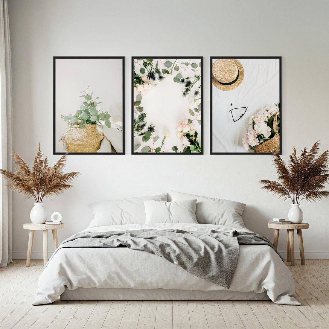Zestaw obrazy w ramie, plakaty - kwiaty, liście, eukaliptus - rama czarna