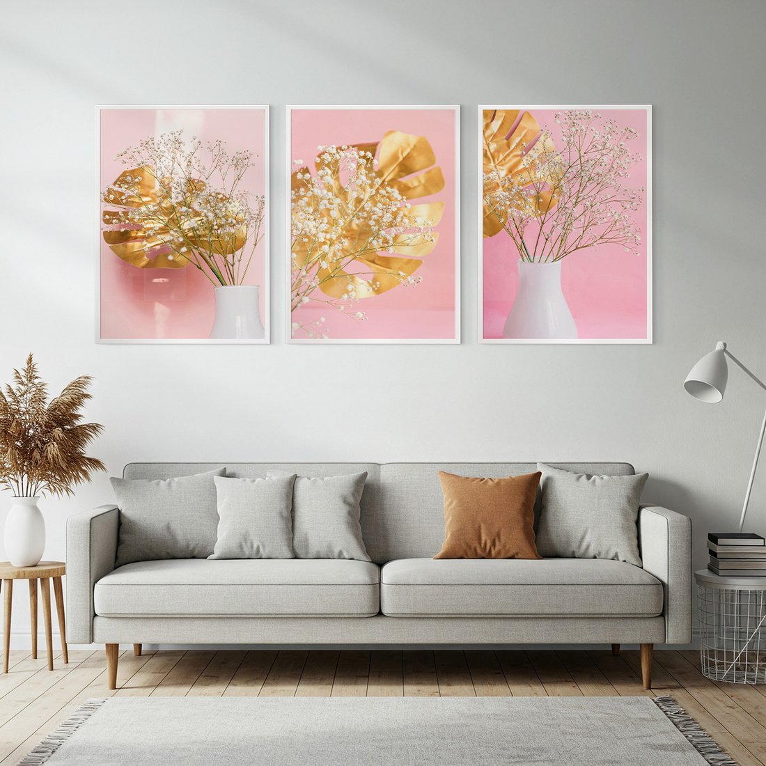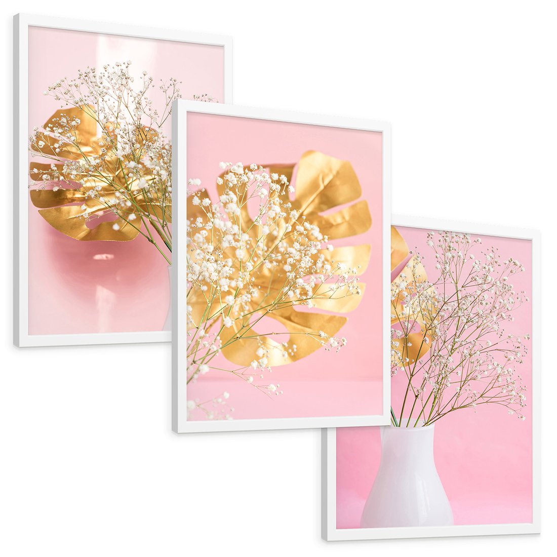 Zestaw obrazy w ramie, plakaty - kwiaty, liście, złoty - rama biała