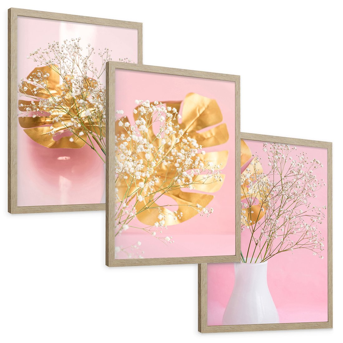 Zestaw obrazy w ramie, plakaty - kwiaty, liście, złoty - rama drewno