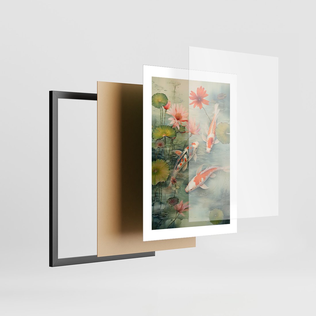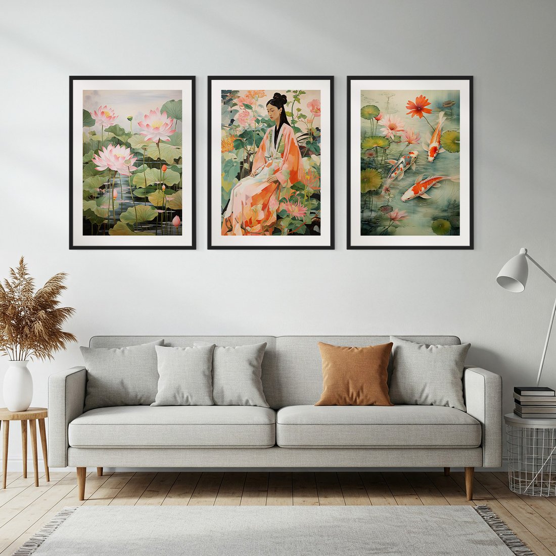 • Zestaw obrazy w ramie, plakaty - kwiaty lotosu, ryby koi, azjatycka kobieta