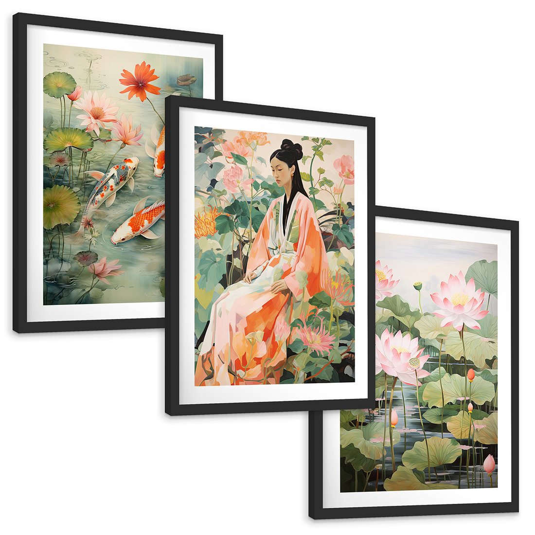 Zestaw obrazy w ramie, plakaty - kwiaty lotosu, ryby koi, azjatycka kobieta - rama czarna
