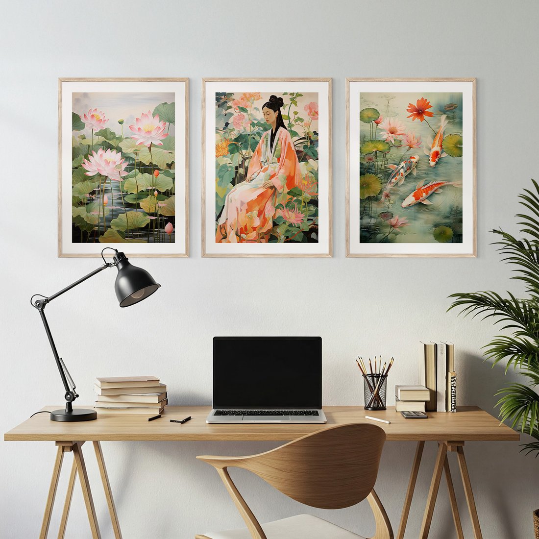 Zestaw obrazy w ramie, plakaty - kwiaty lotosu, ryby koi, azjatycka kobieta - rama drewno