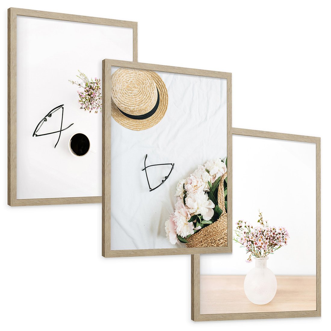 Zestaw obrazy w ramie, plakaty - kwiaty, okulary, kompozycja - rama drewno