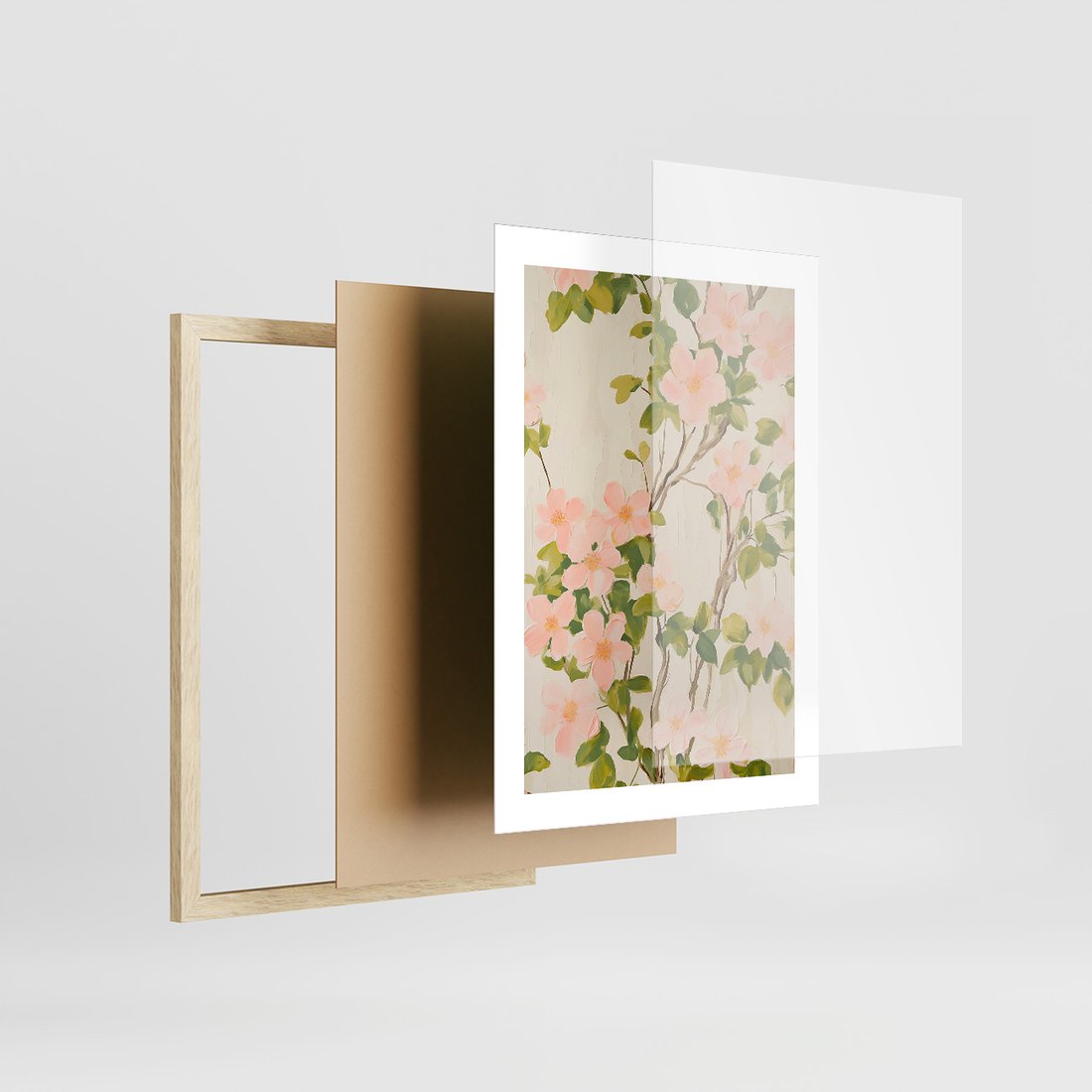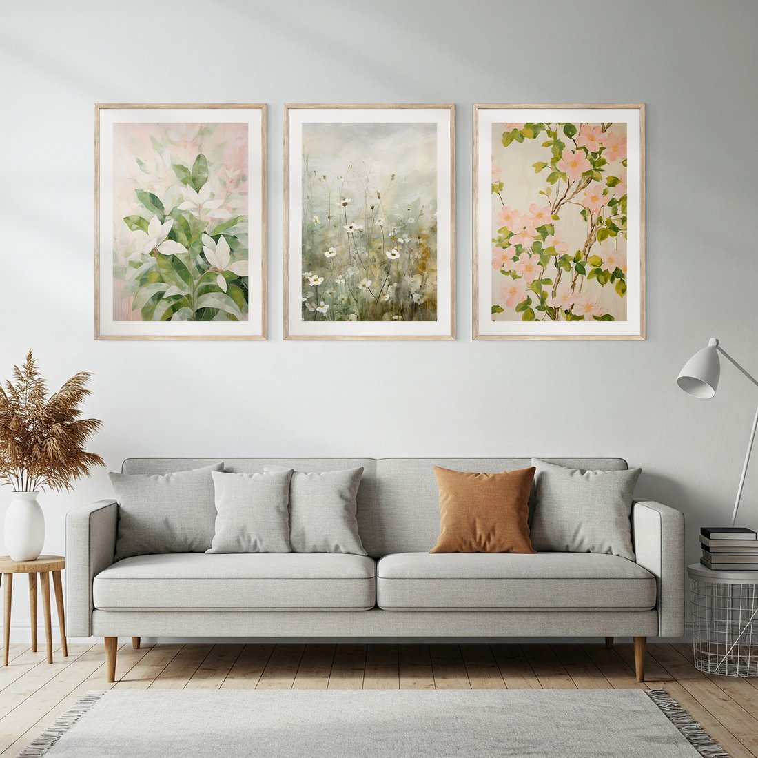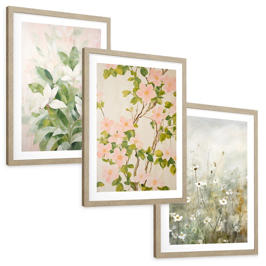 Zestaw obrazy w ramie, plakaty - kwiaty, rośliny, pastelowe - rama drewno