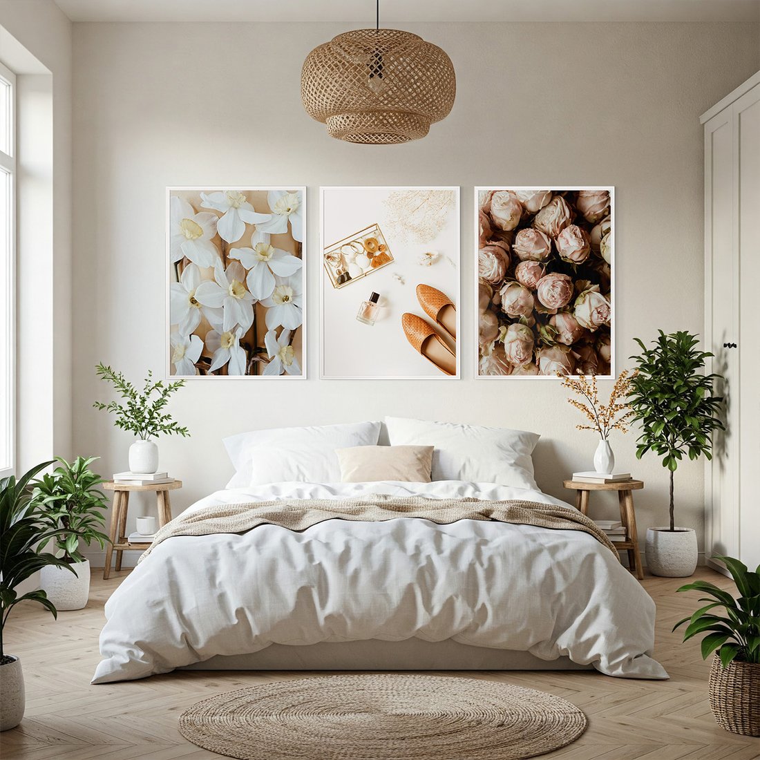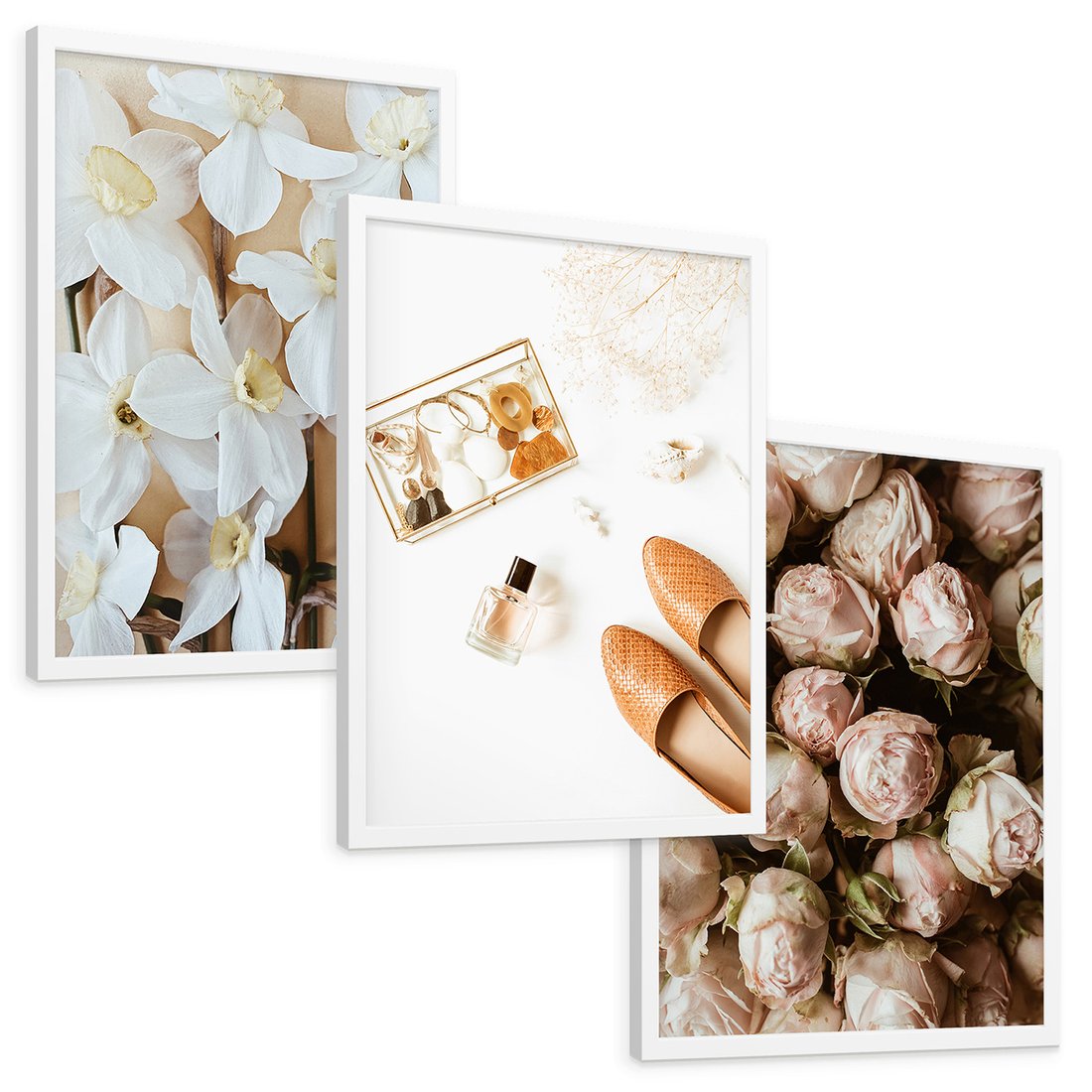 Zestaw obrazy w ramie, plakaty - kwiaty,róże,perfumy - rama biała