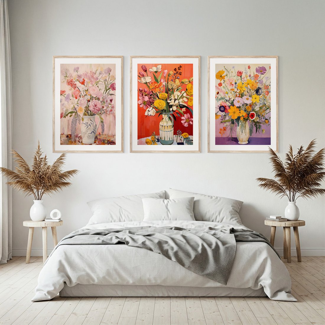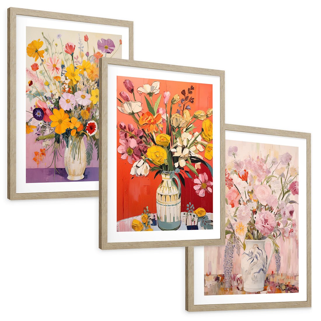Zestaw obrazy w ramie, plakaty - kwiaty, wazon, bukiet - rama drewno