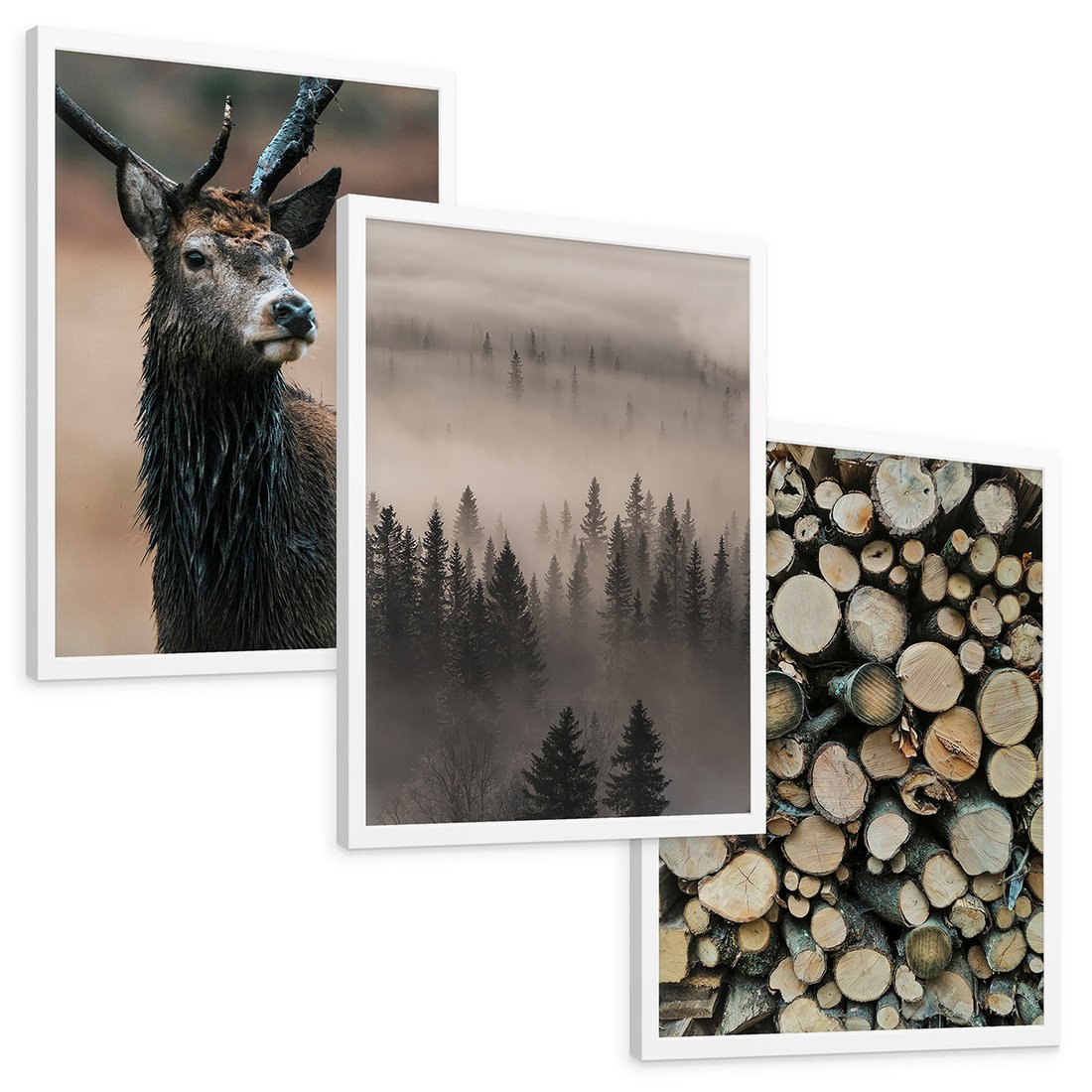 Zestaw obrazy w ramie, plakaty - las, drewno, natura - rama biała