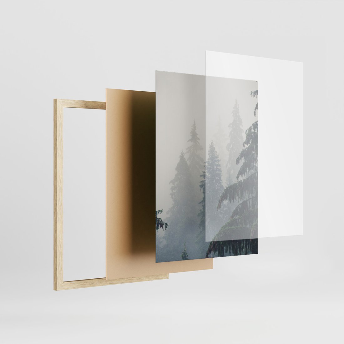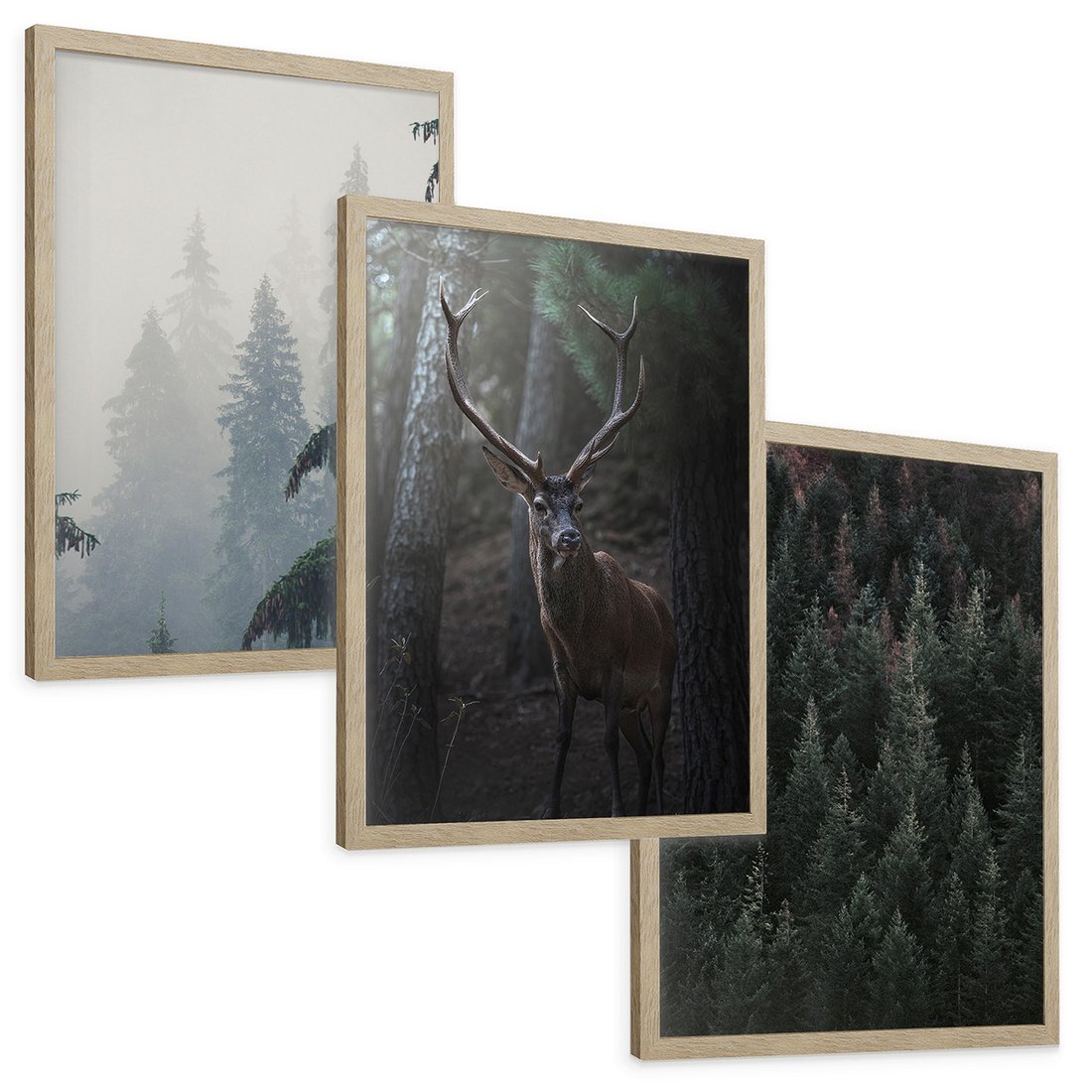 Zestaw obrazy w ramie, plakaty - las, drzewa, jeleń - rama drewno