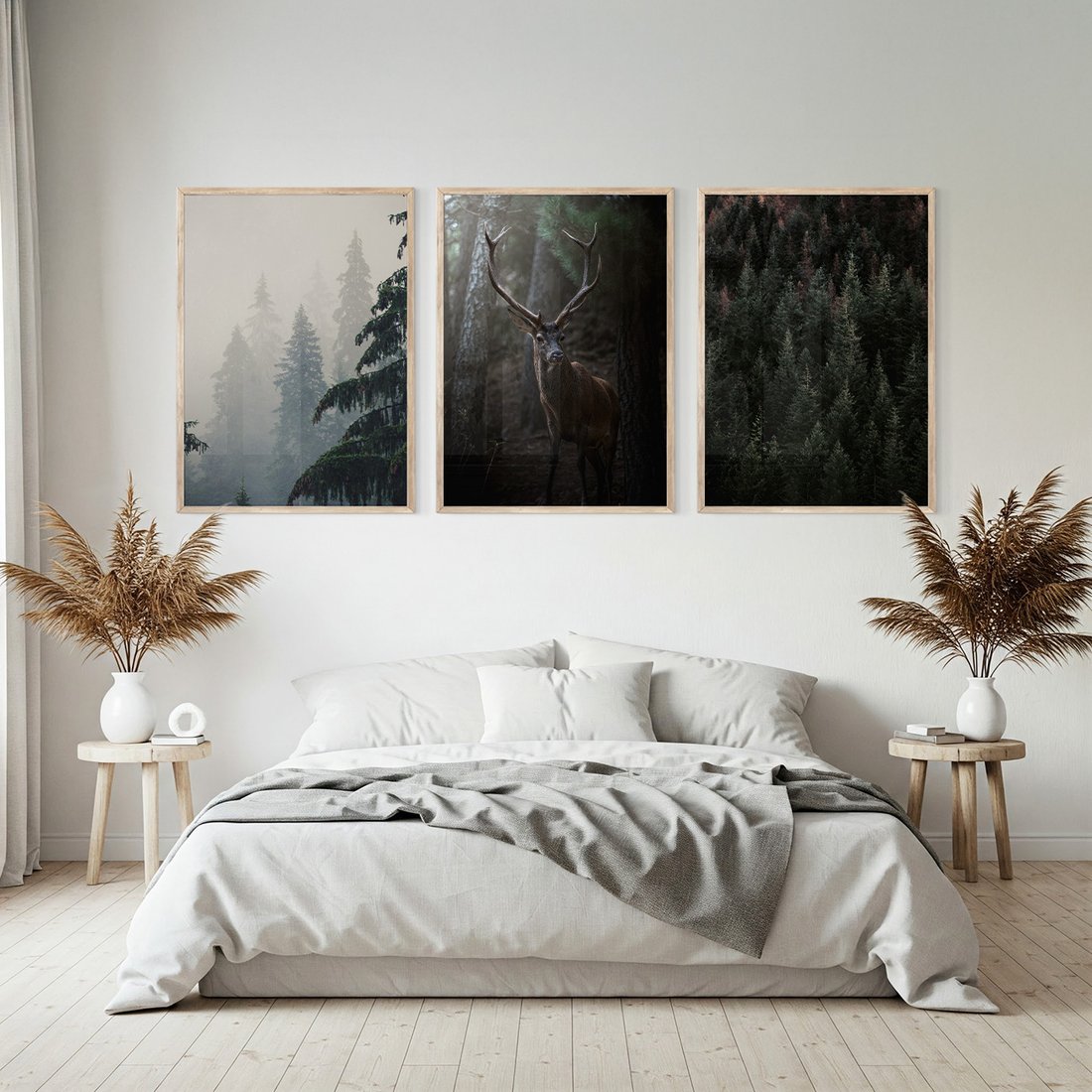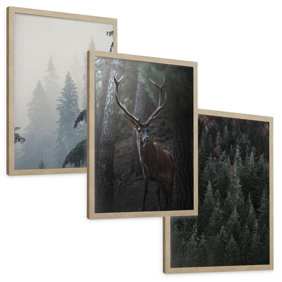 • Zestaw obrazy w ramie, plakaty - las, drzewa, jeleń