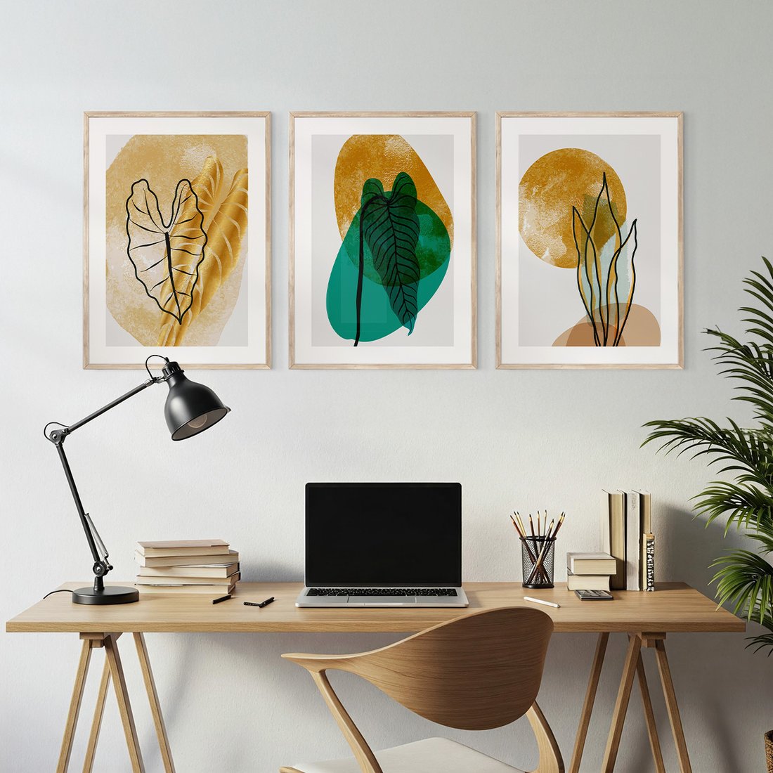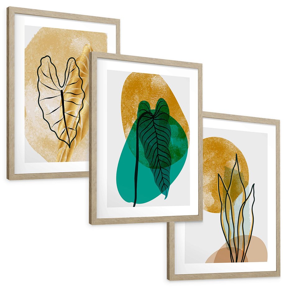 Zestaw obrazy w ramie, plakaty - liście, abstrakcja, rośliny - rama drewno