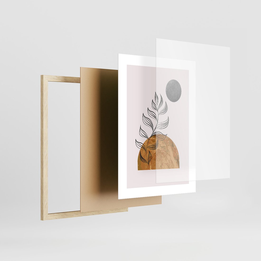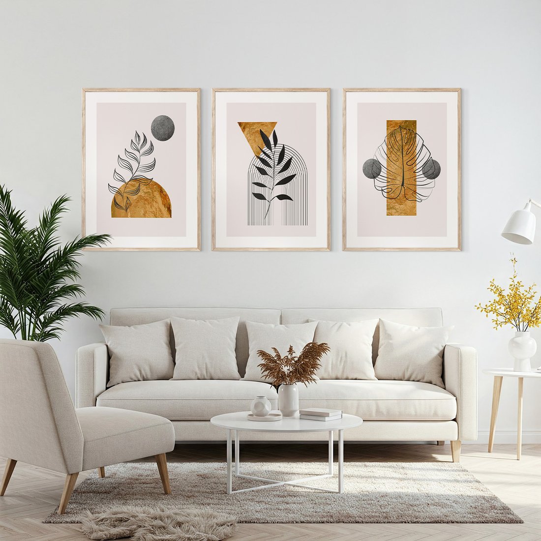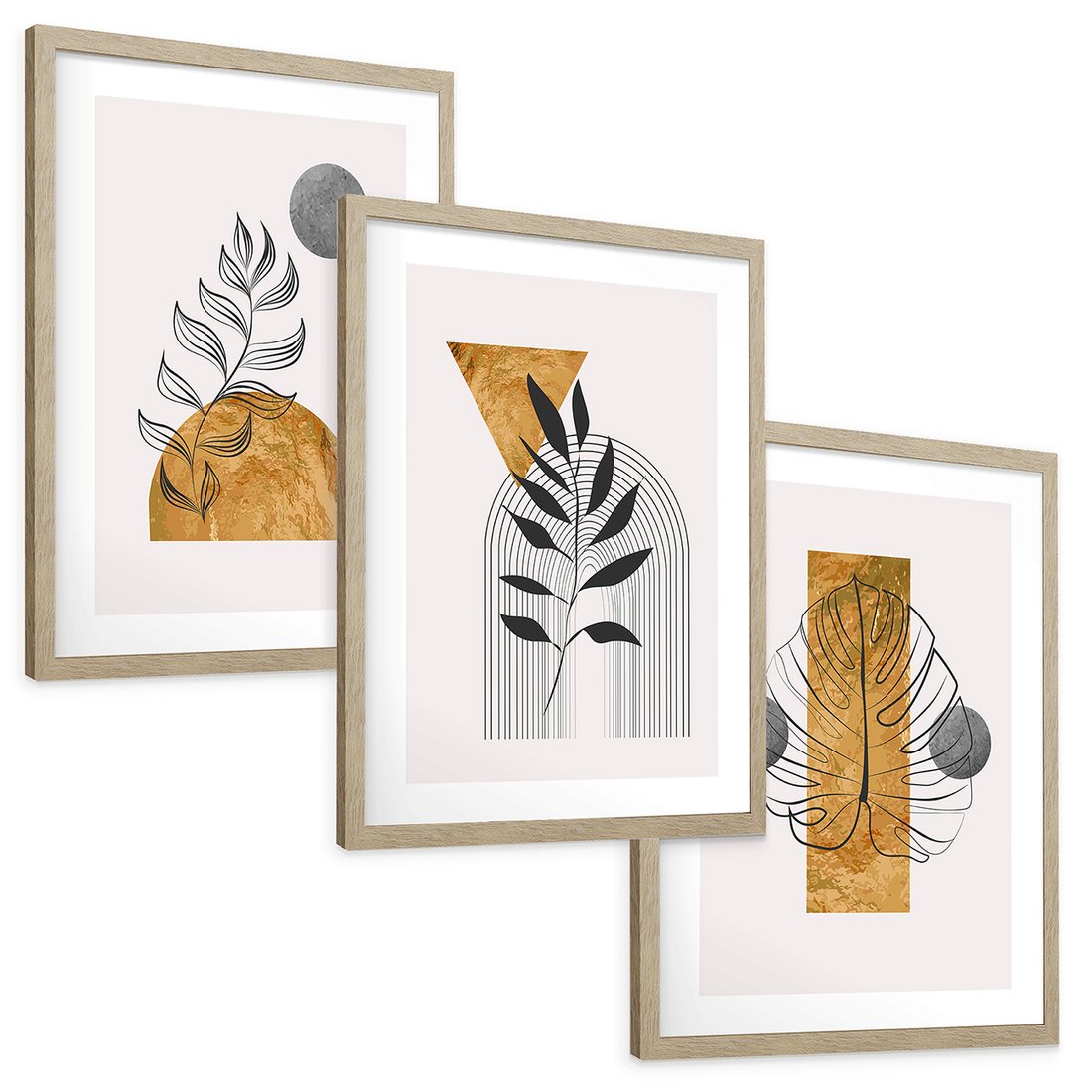 Zestaw obrazy w ramie, plakaty - liście, abstrakcja, złoto - rama drewno