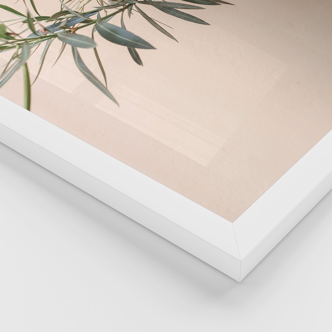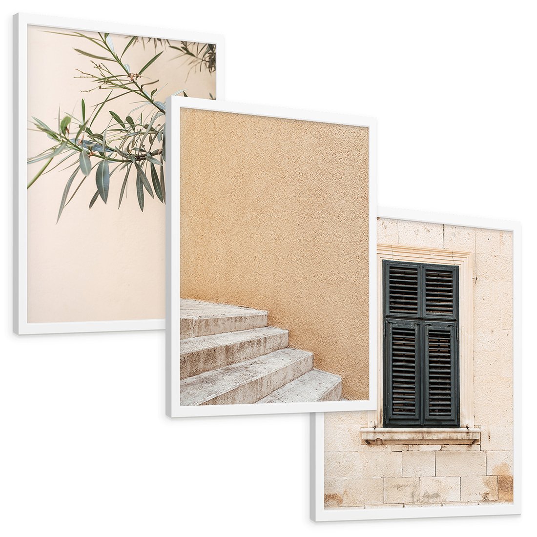 Zestaw obrazy w ramie, plakaty - liście, budynek, okno - rama biała