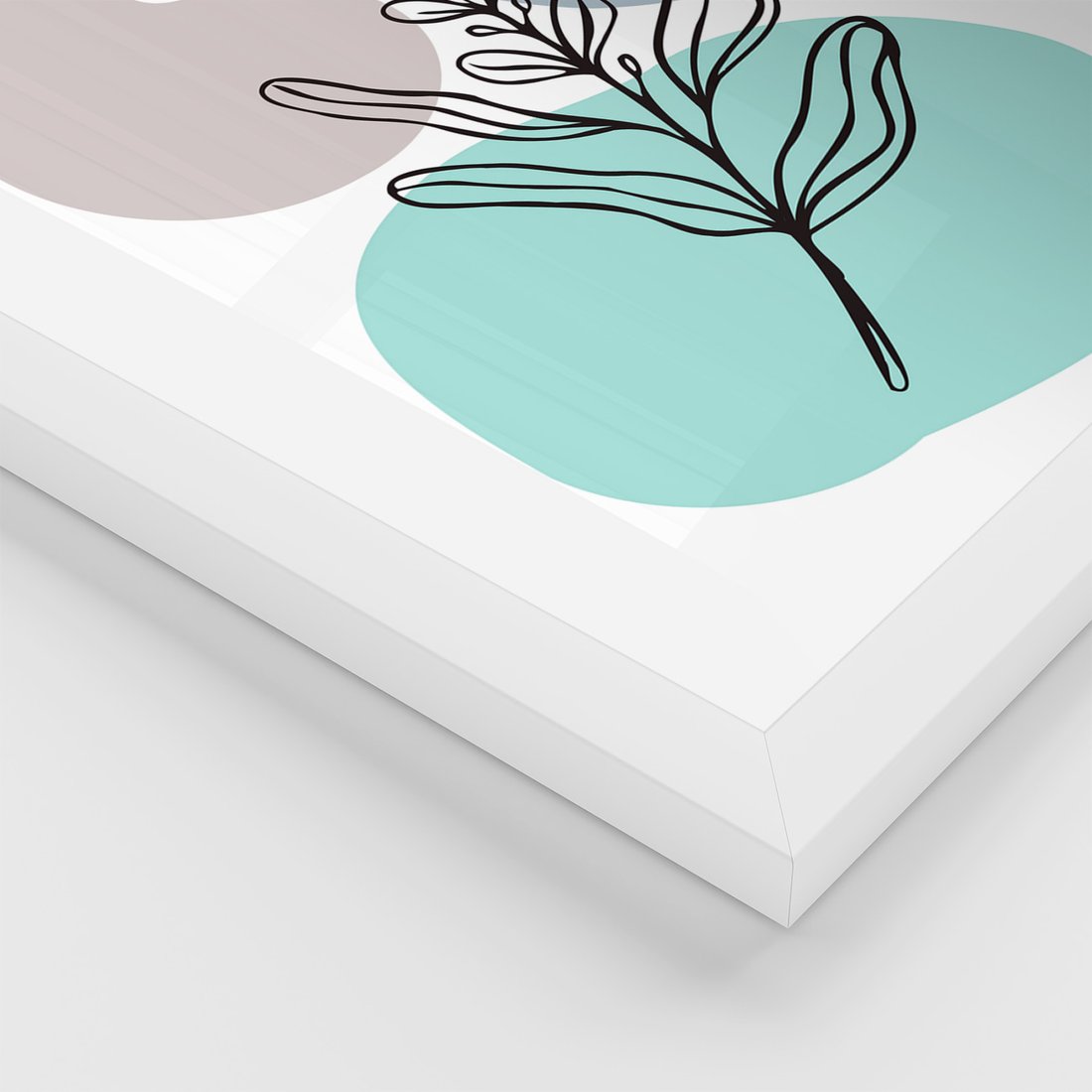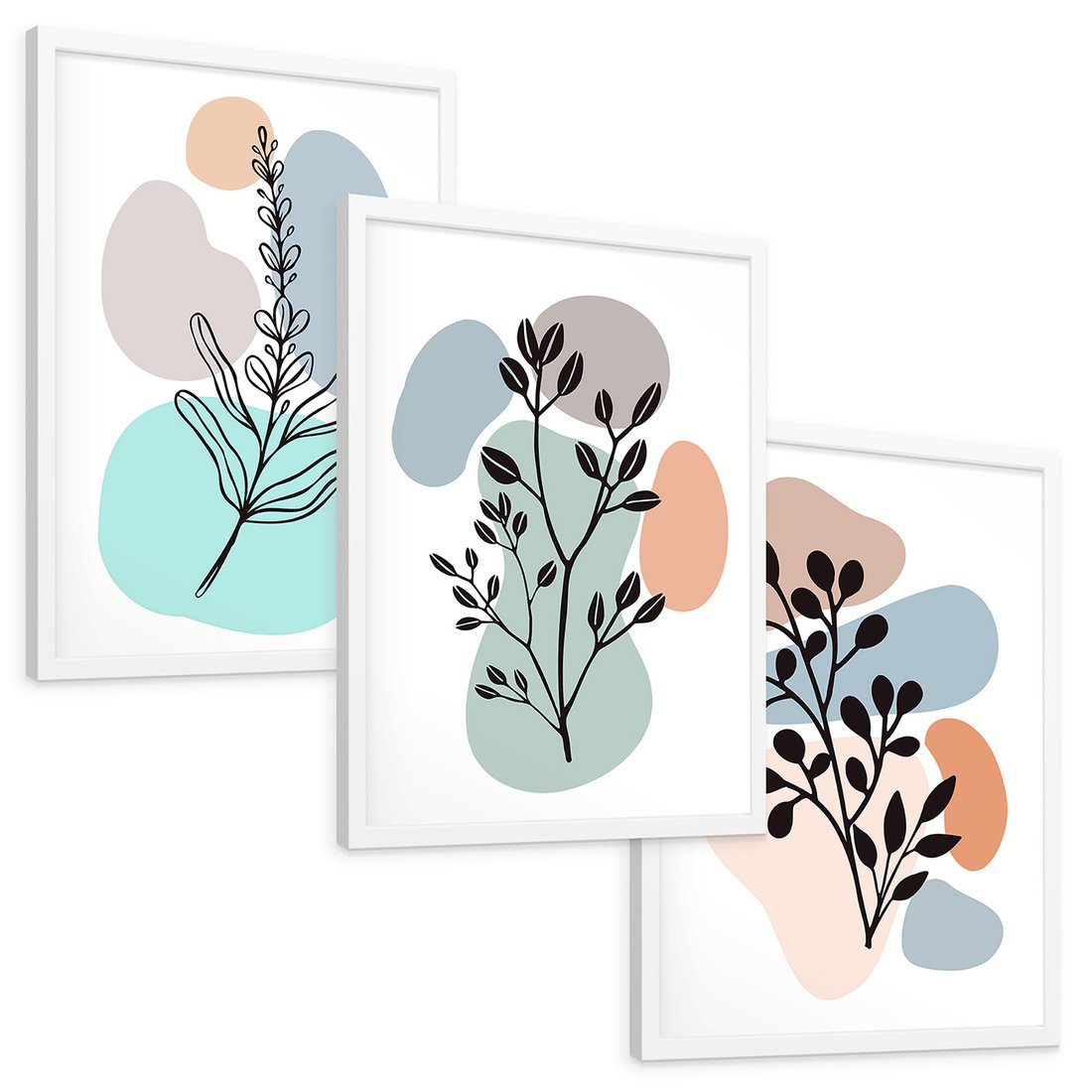 Zestaw obrazy w ramie, plakaty - liście, gałązki, abstrakcja - rama biała