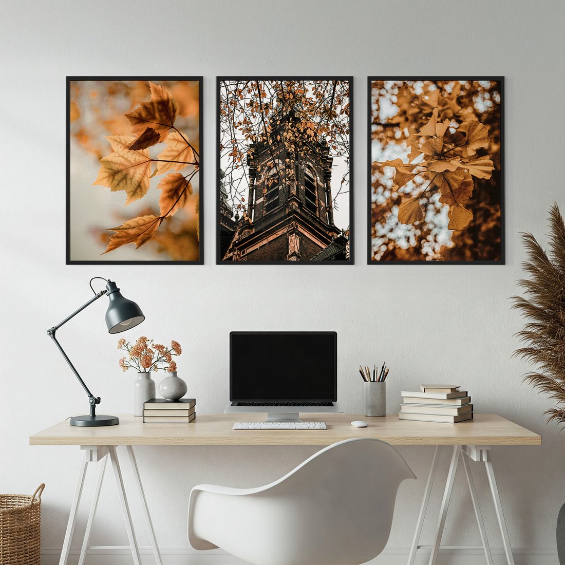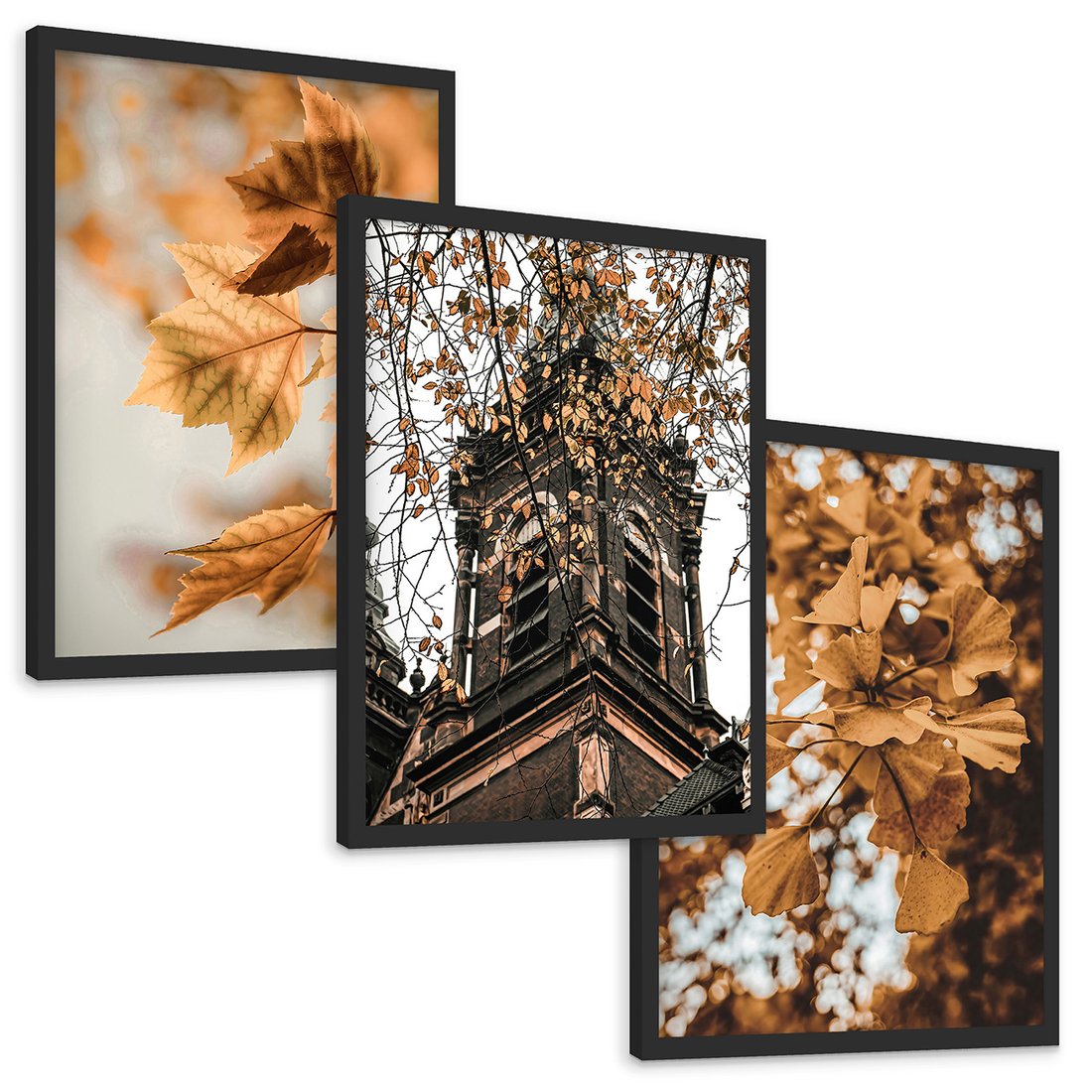 - Zestaw obrazy w ramie, plakaty - liście, jesień, budynek