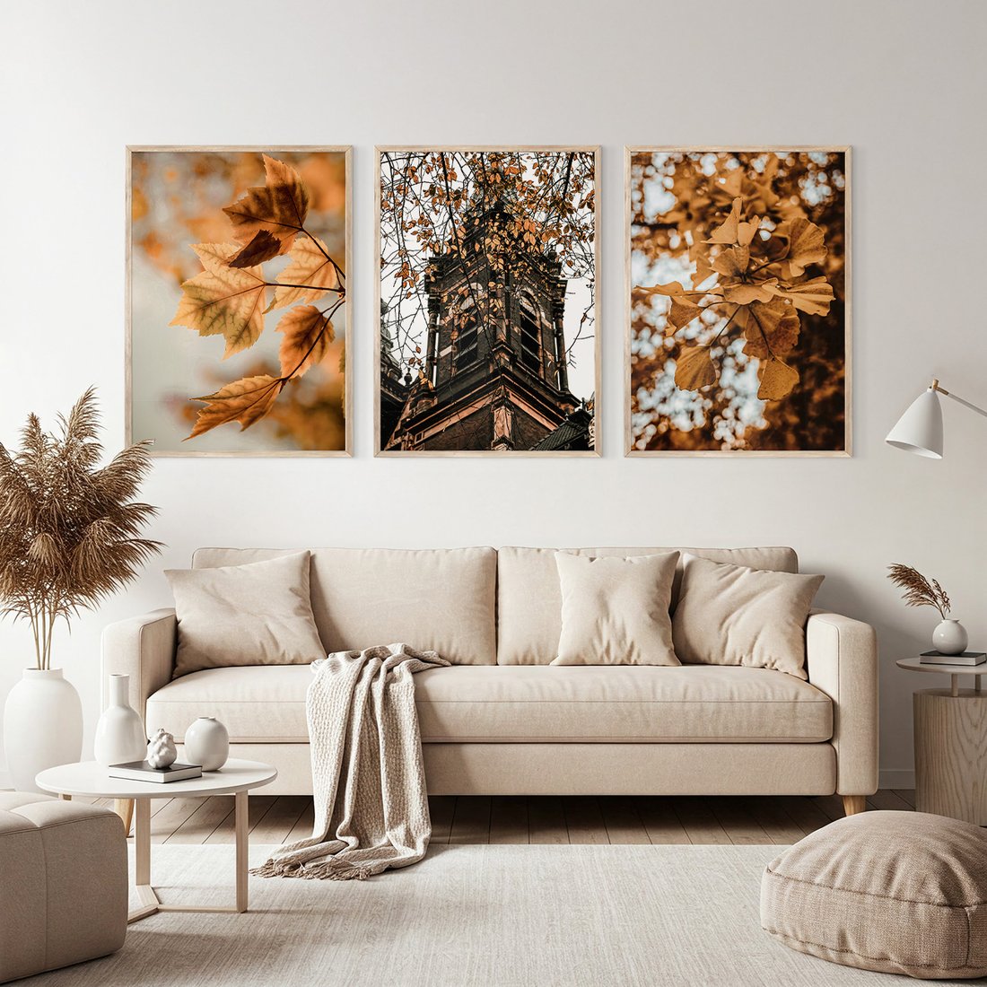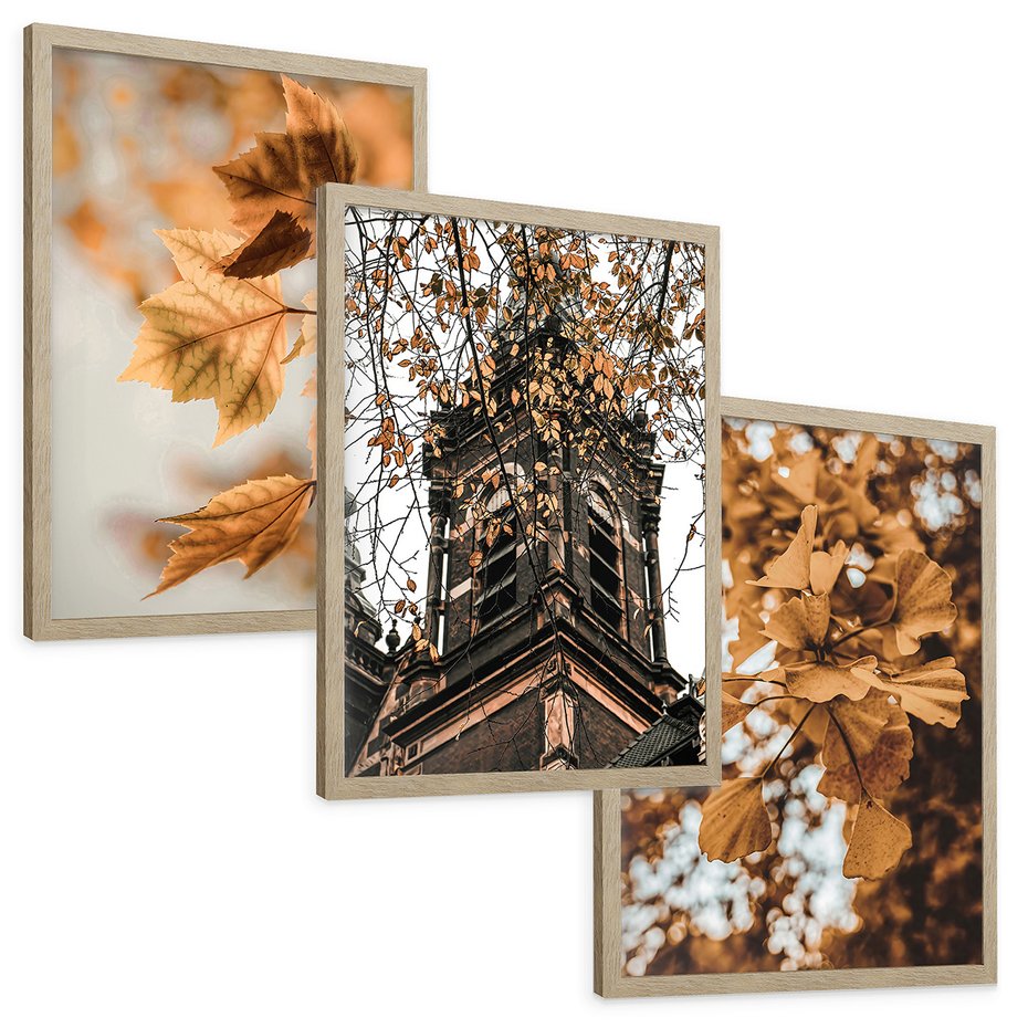 • Zestaw obrazy w ramie, plakaty - liście, jesień, budynek