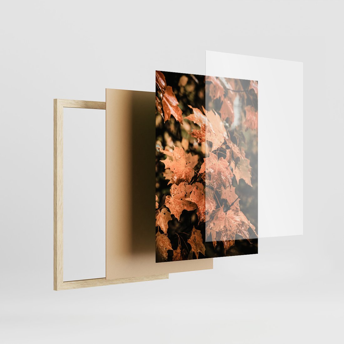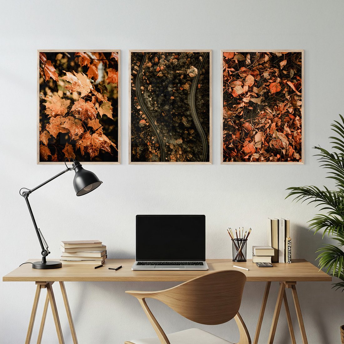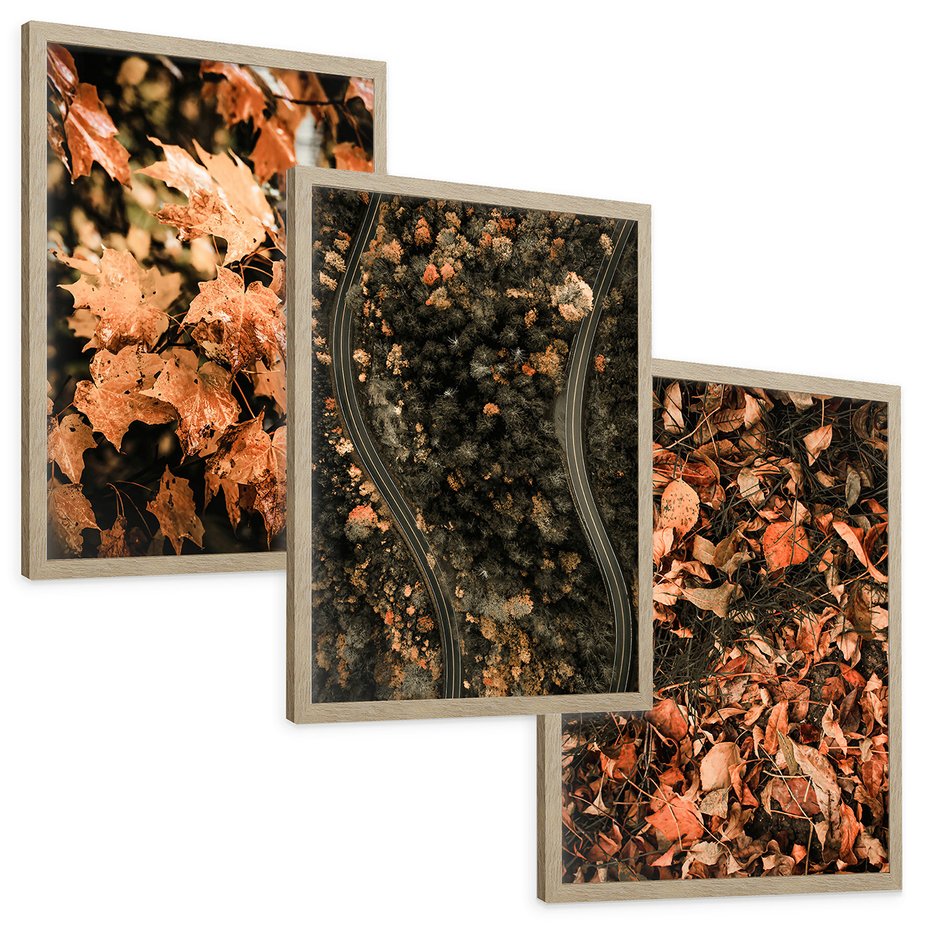 Zestaw obrazy w ramie, plakaty - liście, jesień, droga - rama drewno
