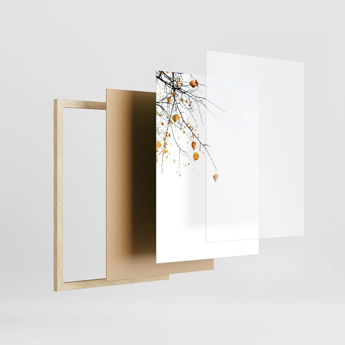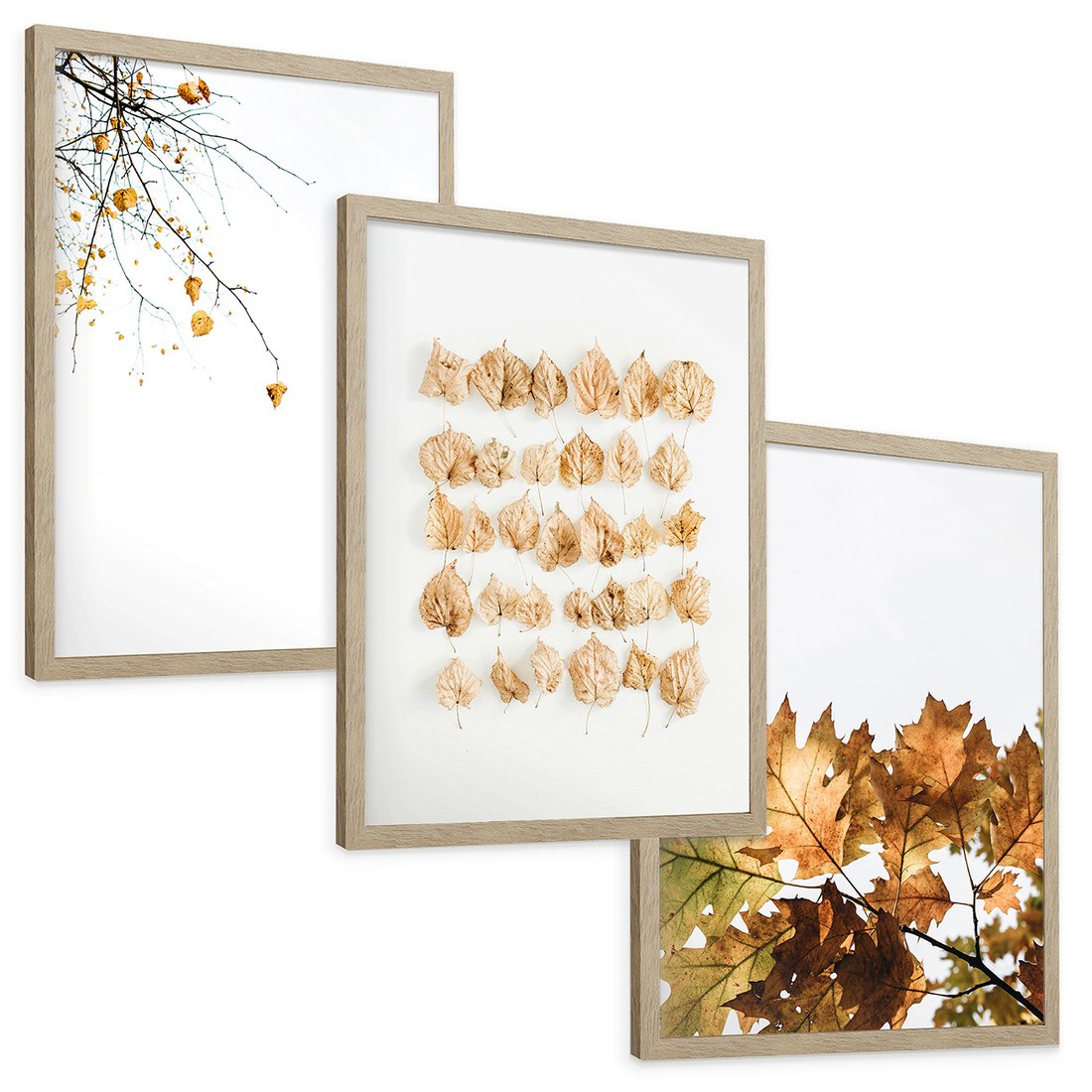 Zestaw obrazy w ramie, plakaty - liście, jesień, gałęzie - rama drewno