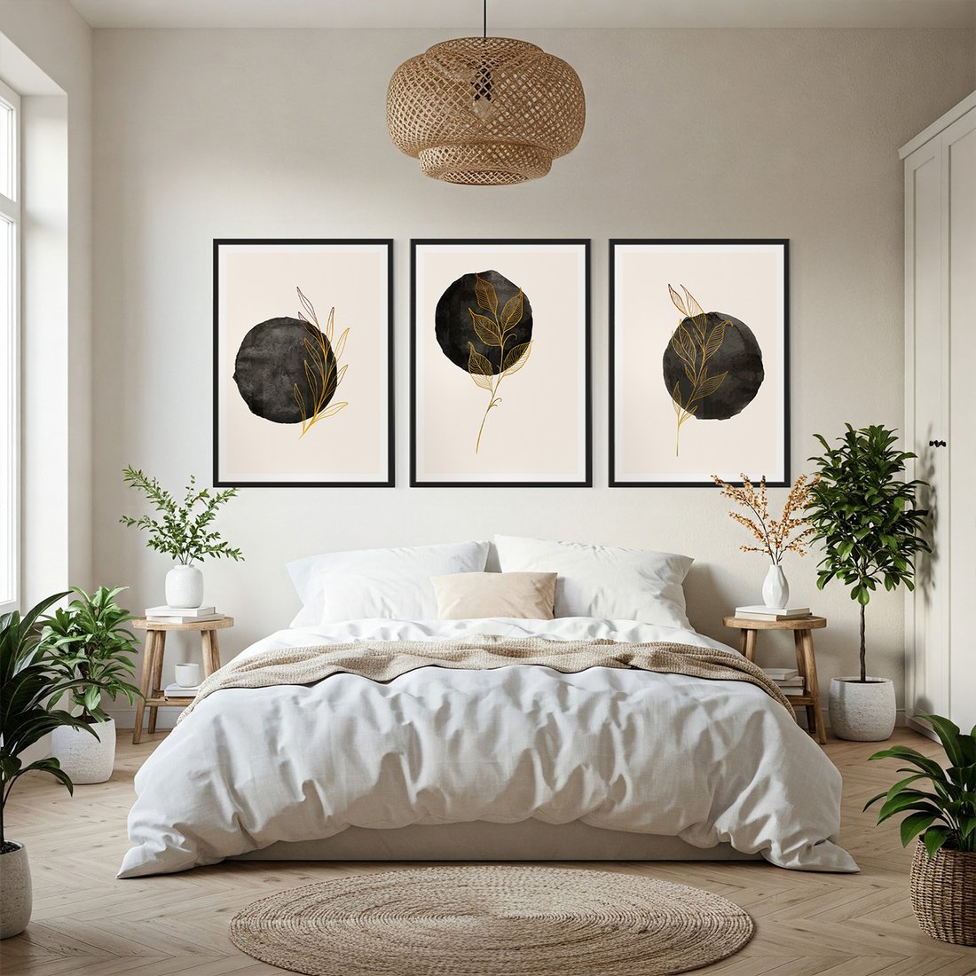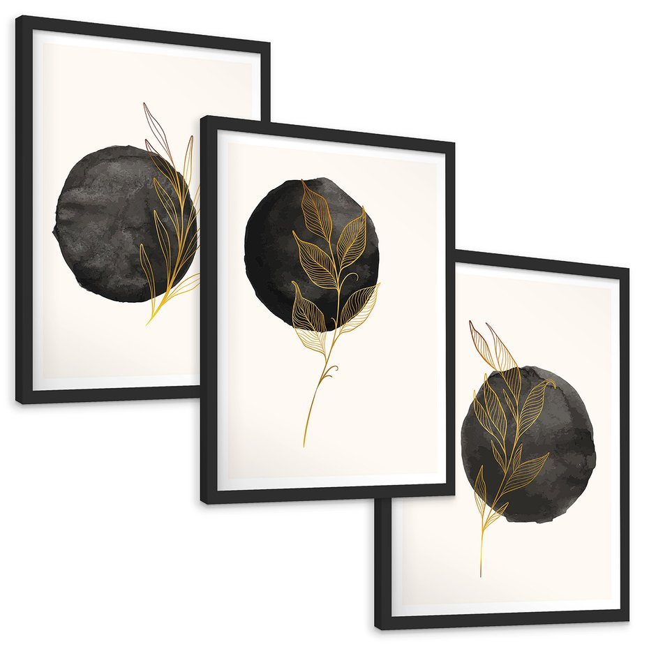 Zestaw obrazy w ramie, plakaty - liście, kropka, abstrakcja - rama czarna